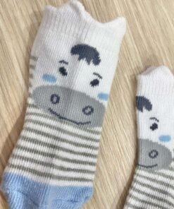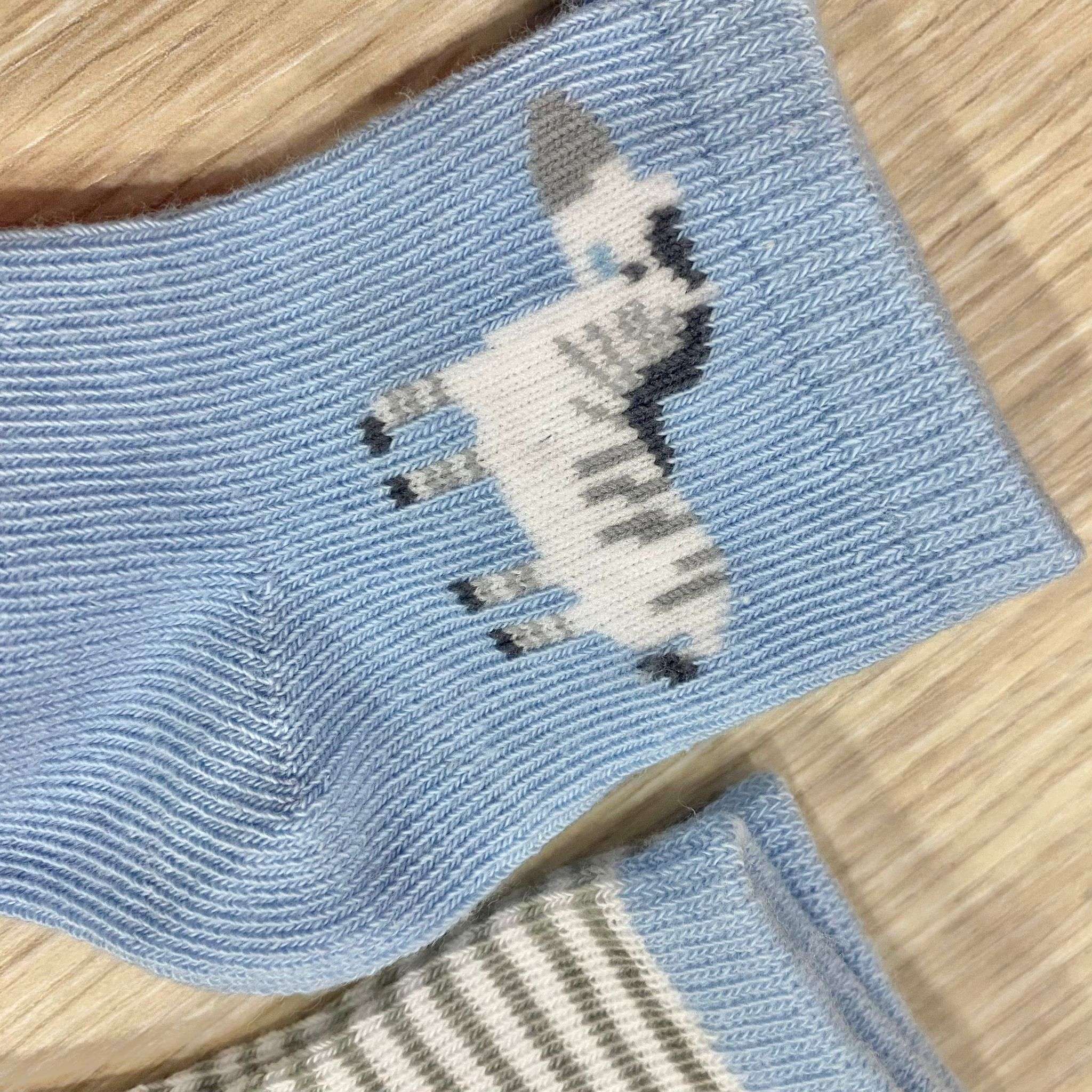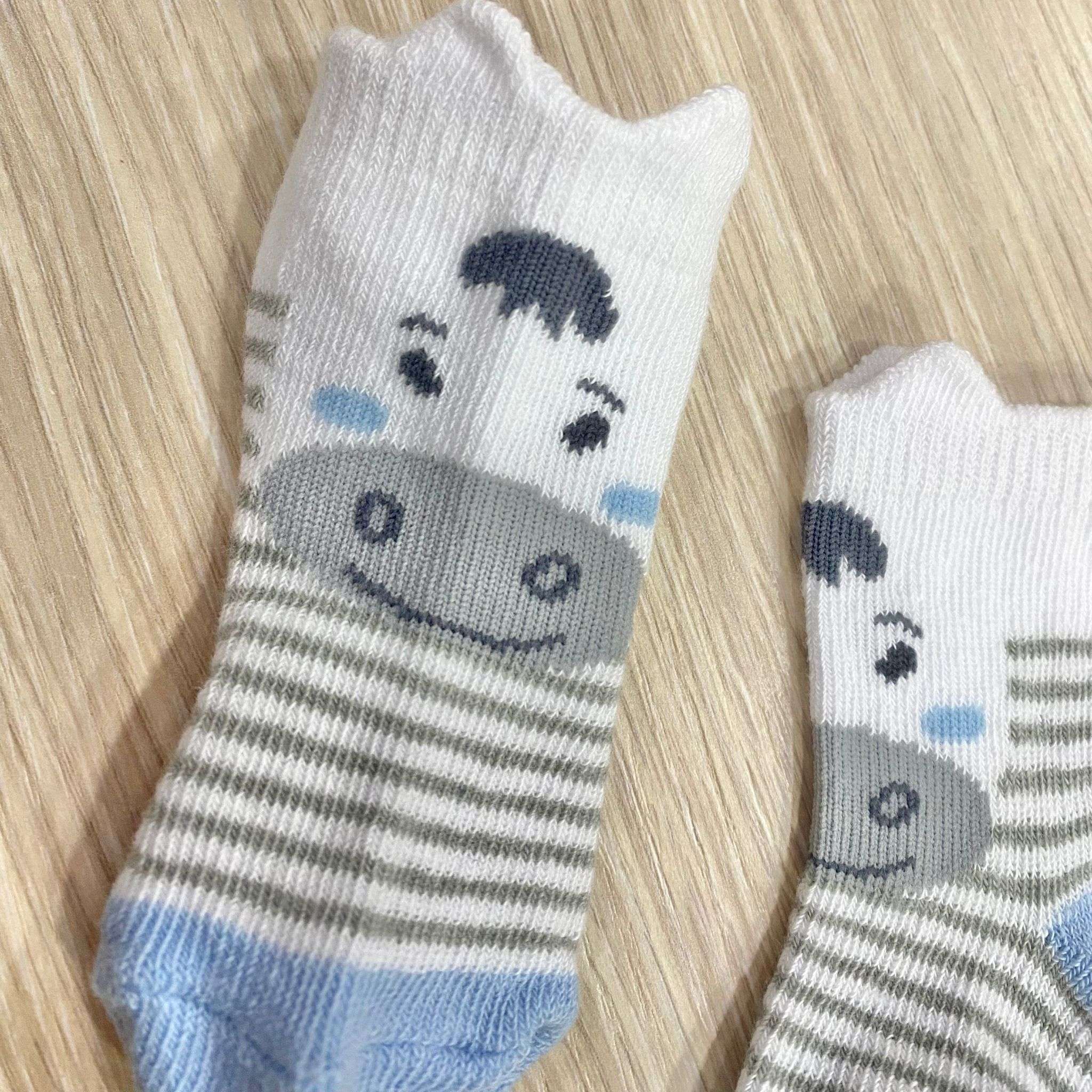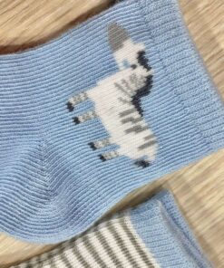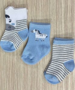 3 pack calzini neonato in cotone, di colore bianco e celeste, con disegni di vari colori.