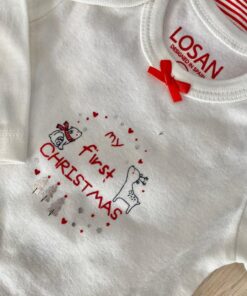 3 pack di body neonata/bambina in caldo cotone. Chiusura nel cavallo con automatici. Stampe di motivi natalizi e invernali e scritta “il mio primo Natale. Presentato in sacchetto con stampa di pallini.