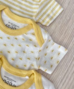 3 pack di body neonato/a/bambino/a in cotone, di colore panna e giallo con disegno di vari colori.