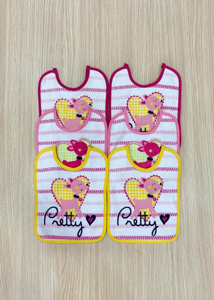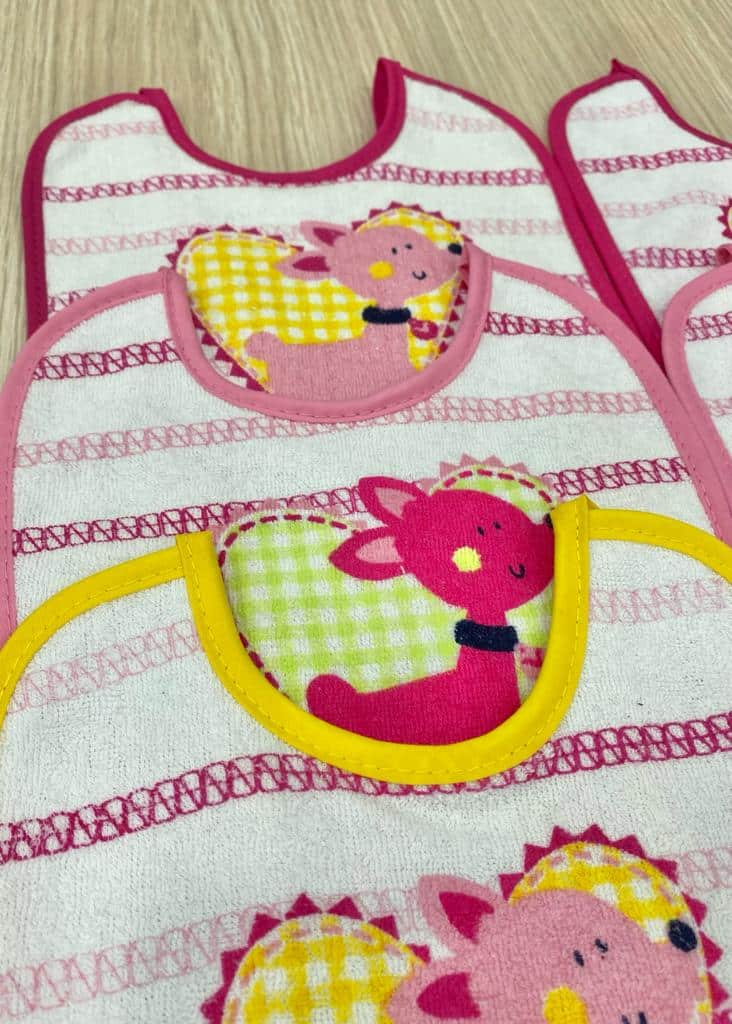 6 pack bavaglini in spugna di cotone, di colore bianco con con bordino di colore giallo, rosa e fucsia e disegno di vari colori.