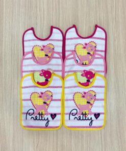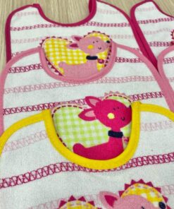 6 pack bavaglini in spugna di cotone, di colore bianco con con bordino di colore giallo, rosa e fucsia e disegno di vari colori.
