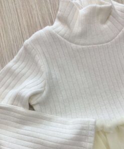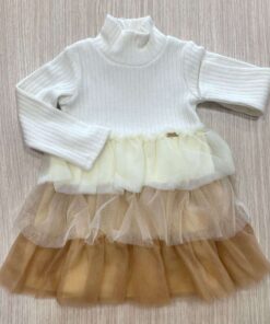 Abitino bambina in caldo cotone, di colore ecrù, con applicazione di tulle di vari colori.