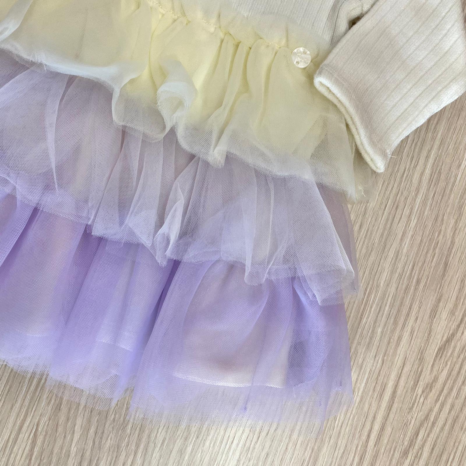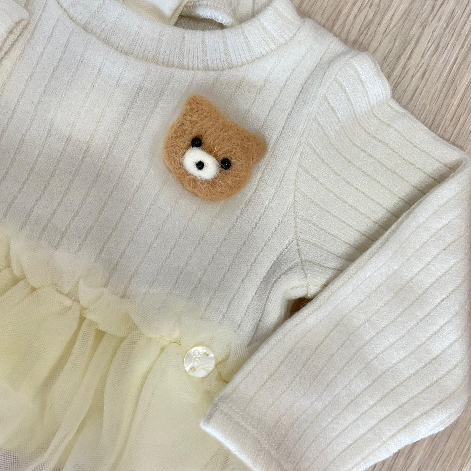 Abitino neonata/bambina in caldo cotone, di colore burro e glicine, con applicazione di tulle, chiusura con cerniera., con applicazione di orsetto in rilievo.