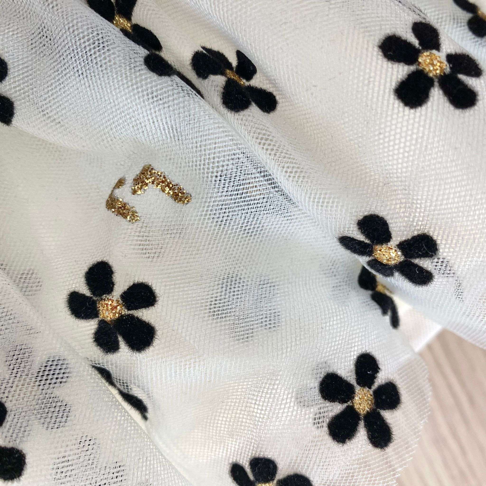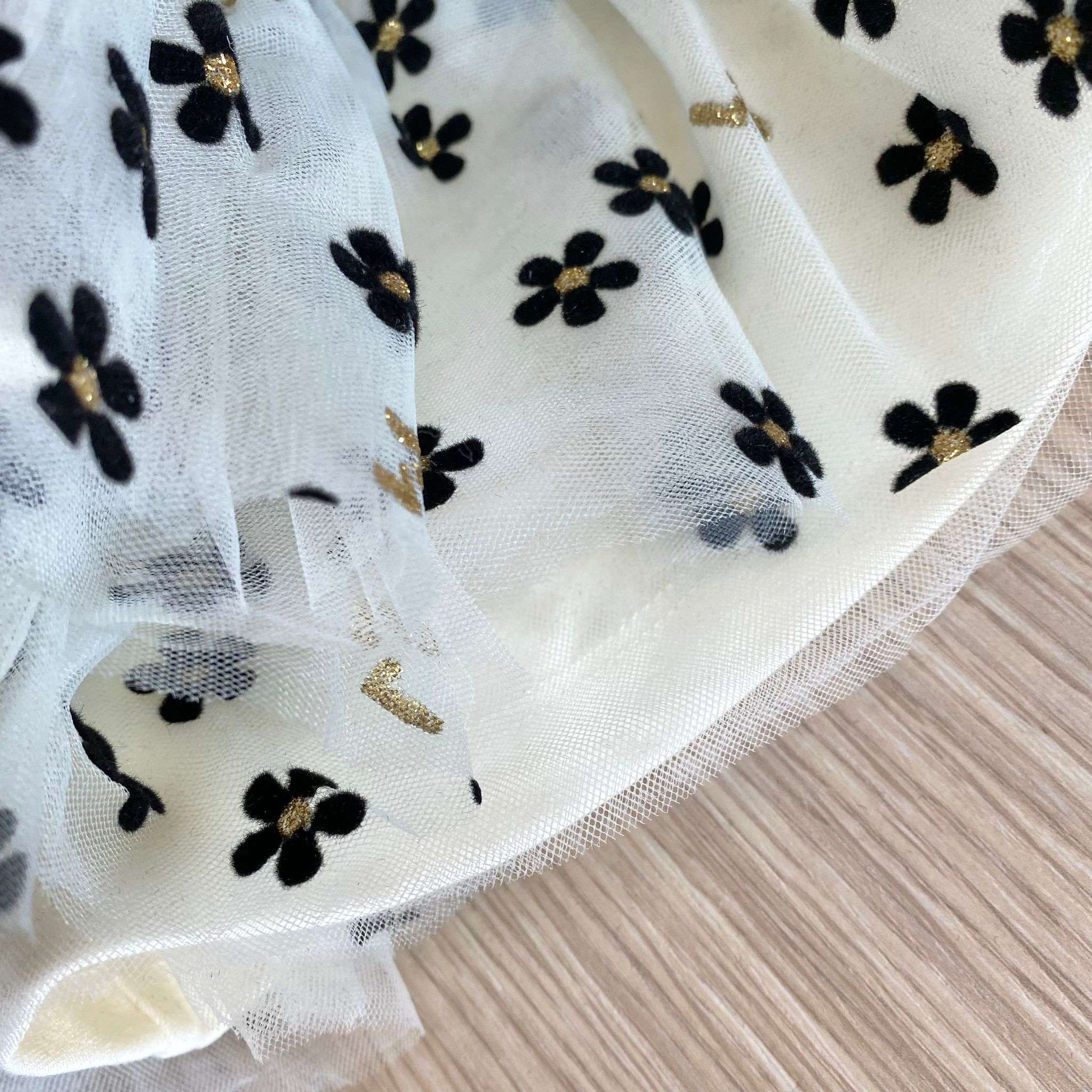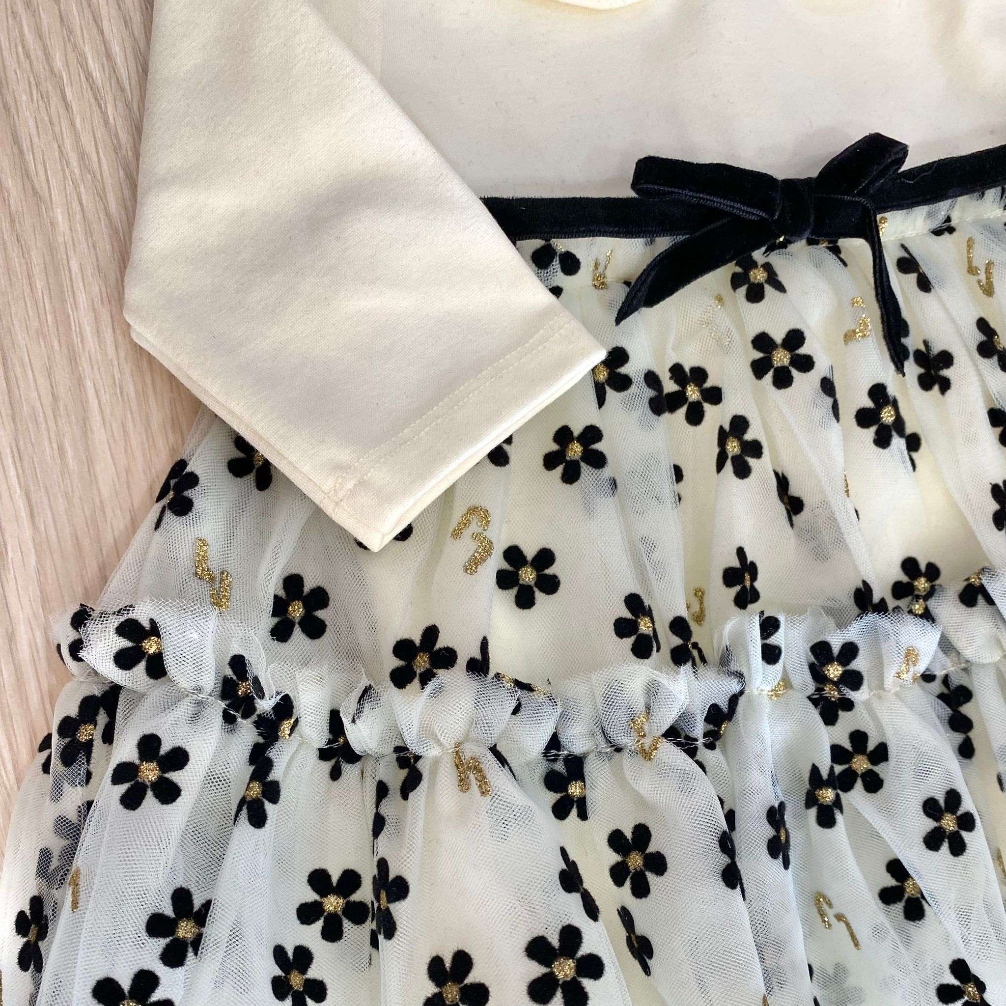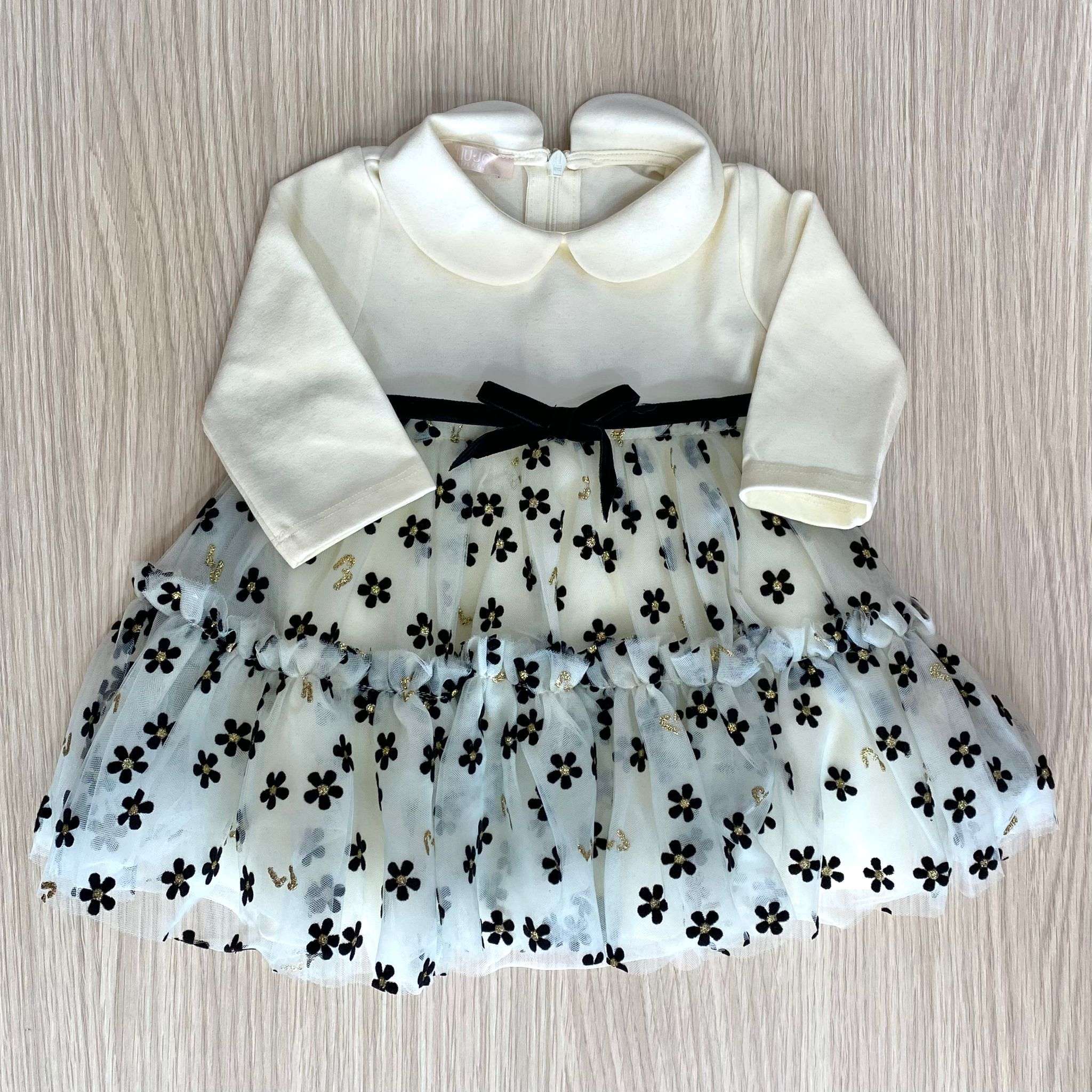 Abitino neonata/bambina in caldo cotone, di colore burro e nero, con con doppia balza in tulle, con dettaglio di fiorellini in velluto e logo dorato.