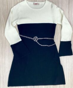 Abito bambina/ragazza svasato in maglina, di colore nero e burro con cintura in acciaio accessoriata di logo. Abitino con manica svasata e spacco laterale.