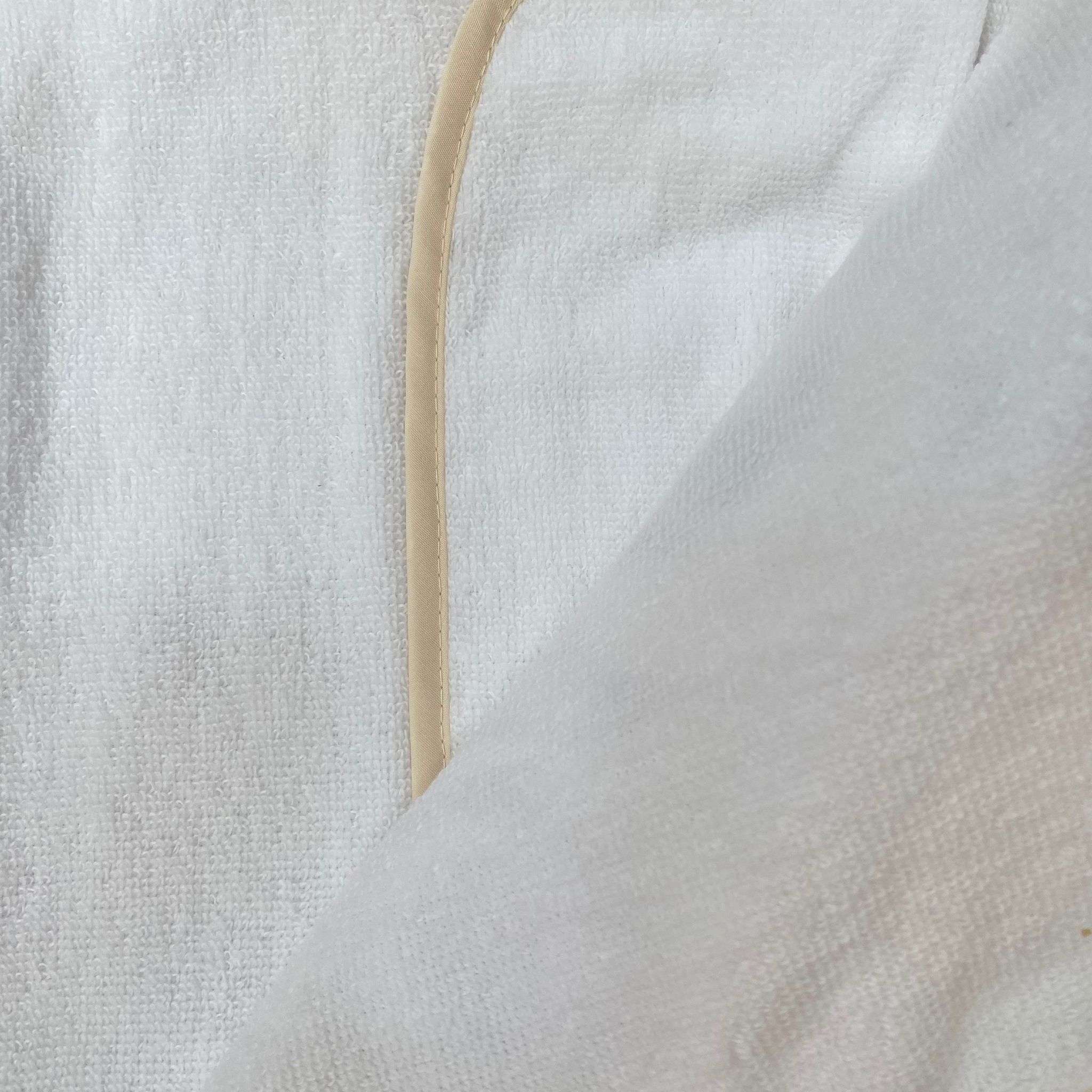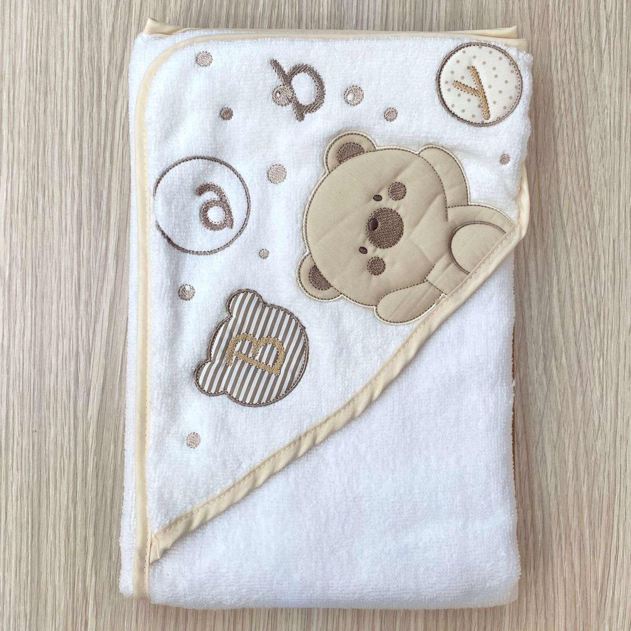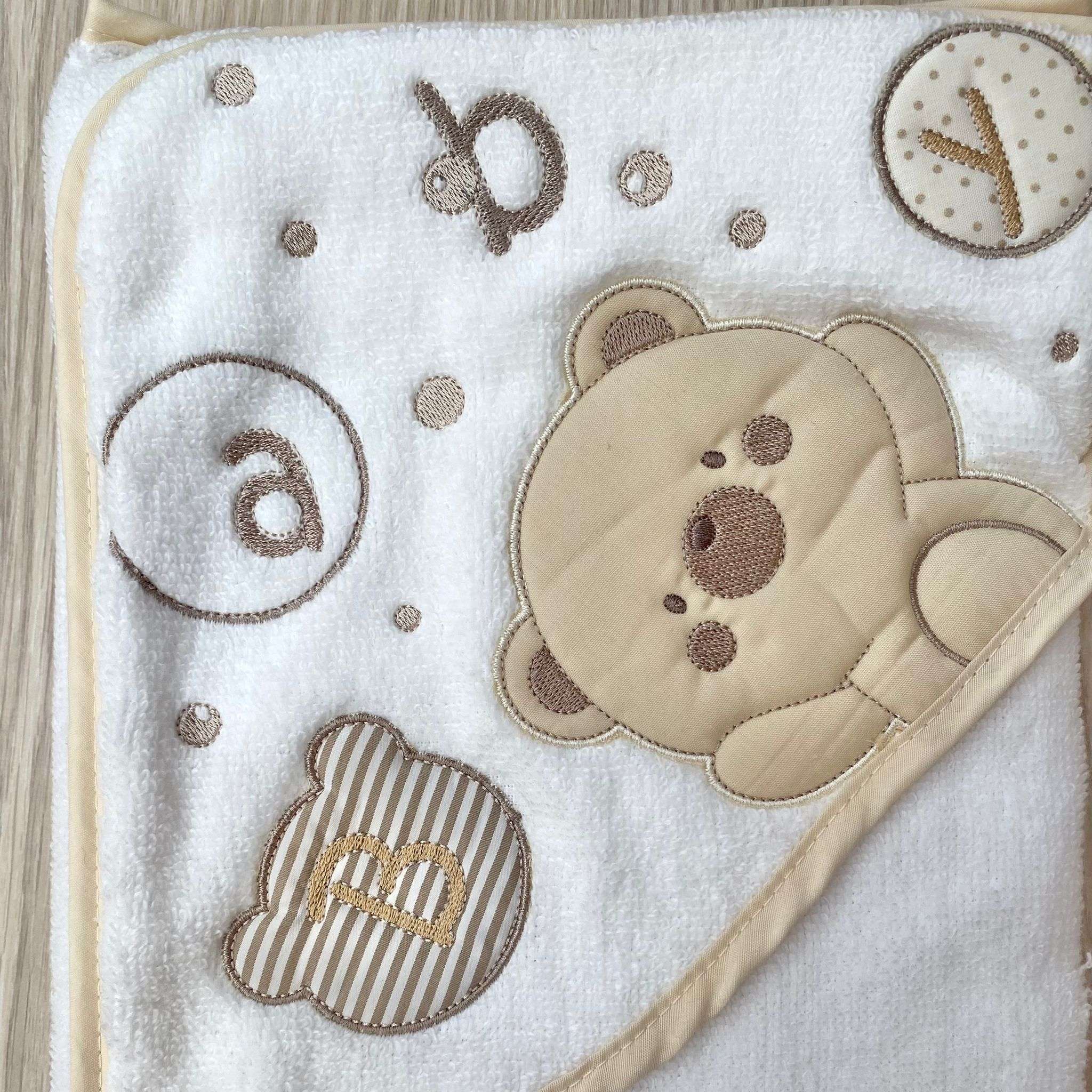 Accappatoio triangolo neonato/a in spugna di cotone, di colore panna e beige con disegno e scritta ricamata in rilievo.