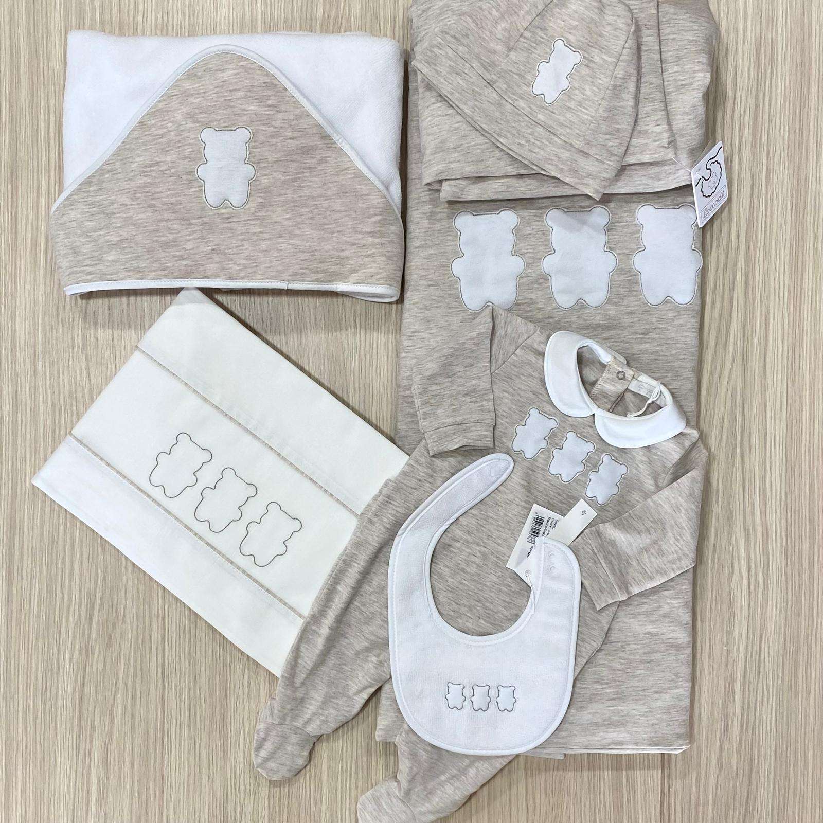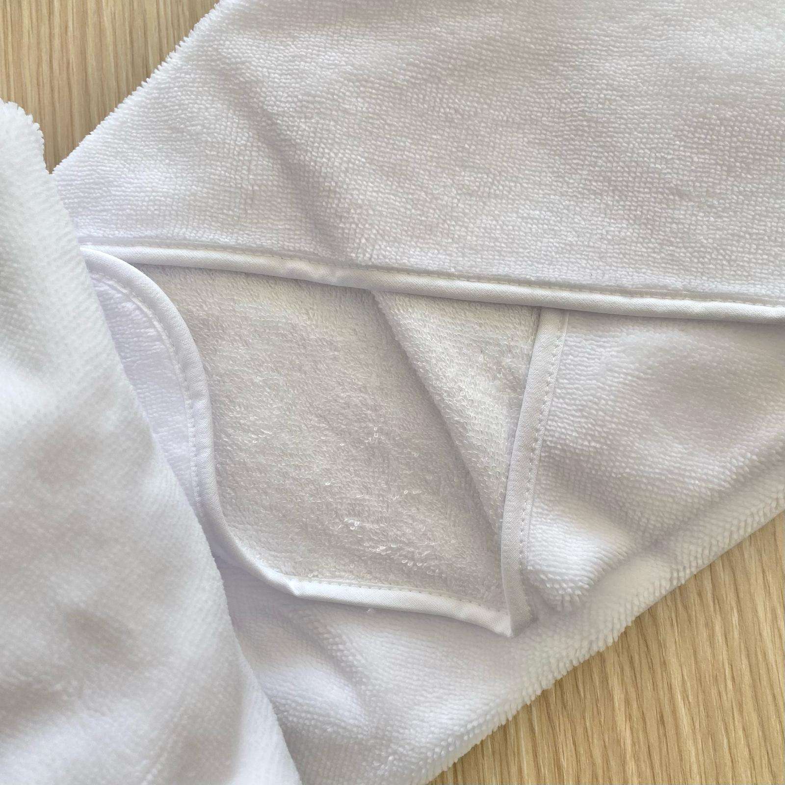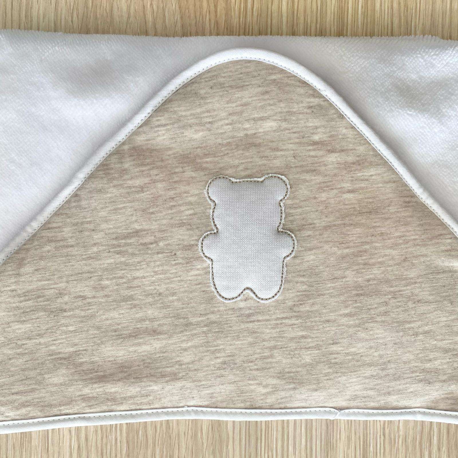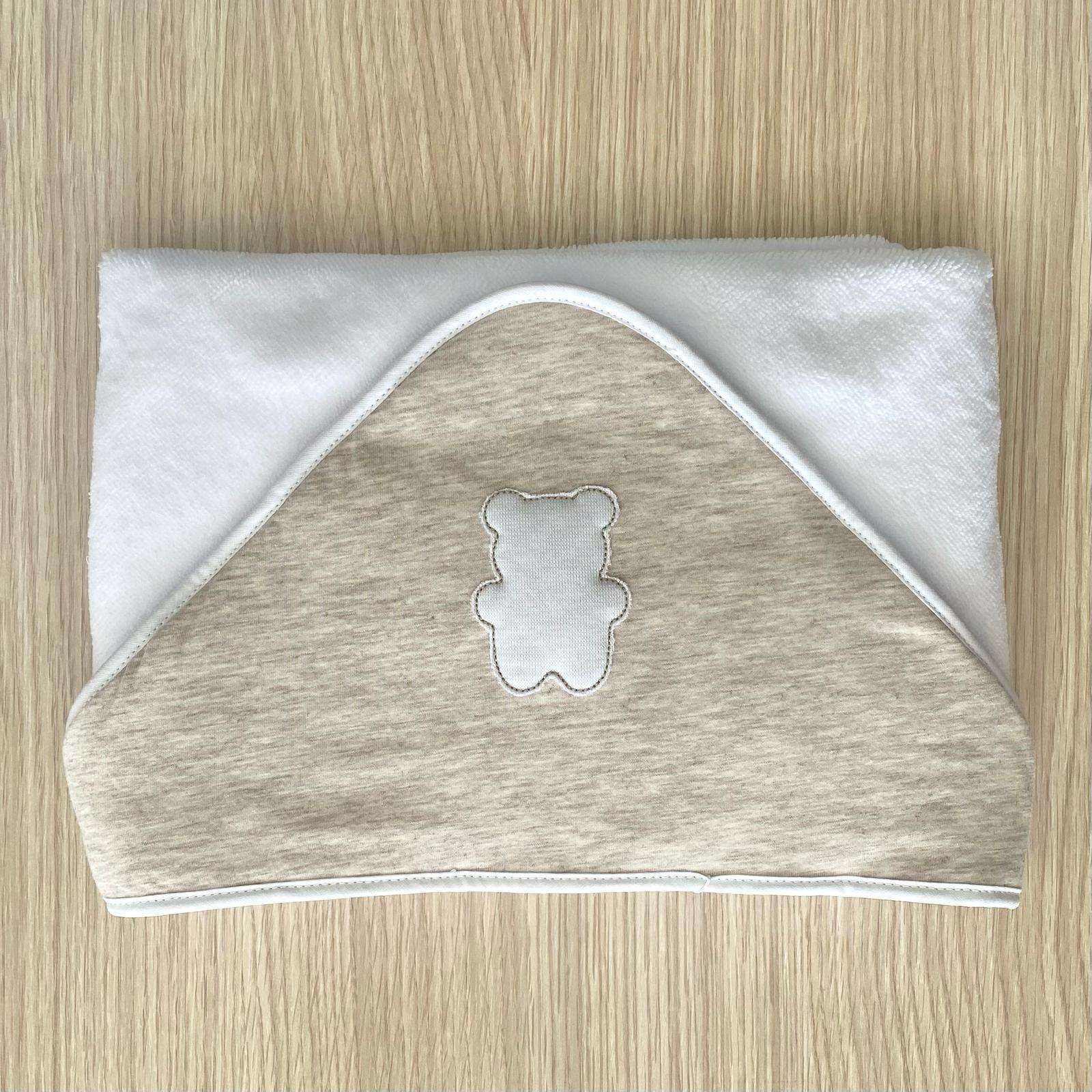 Accappatoio triangolo neonato in spugna di cotone, di colore bianco e sabbia, con disegno ricamato.