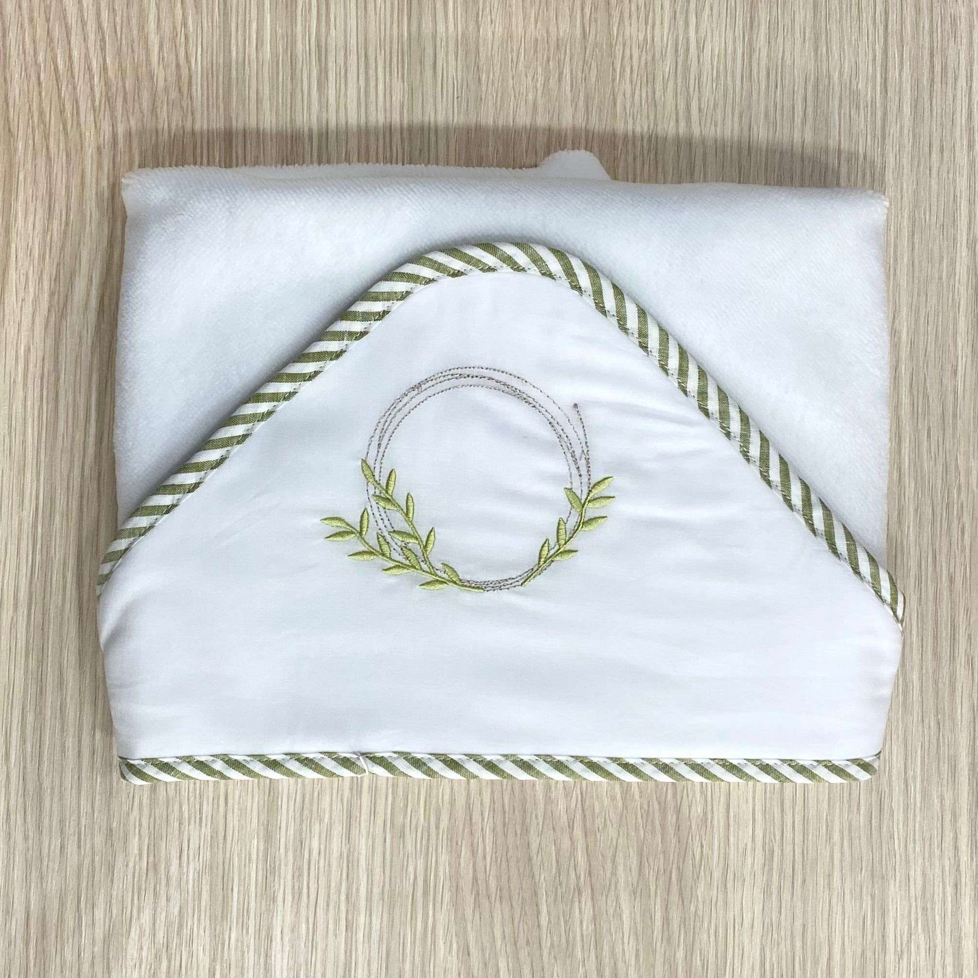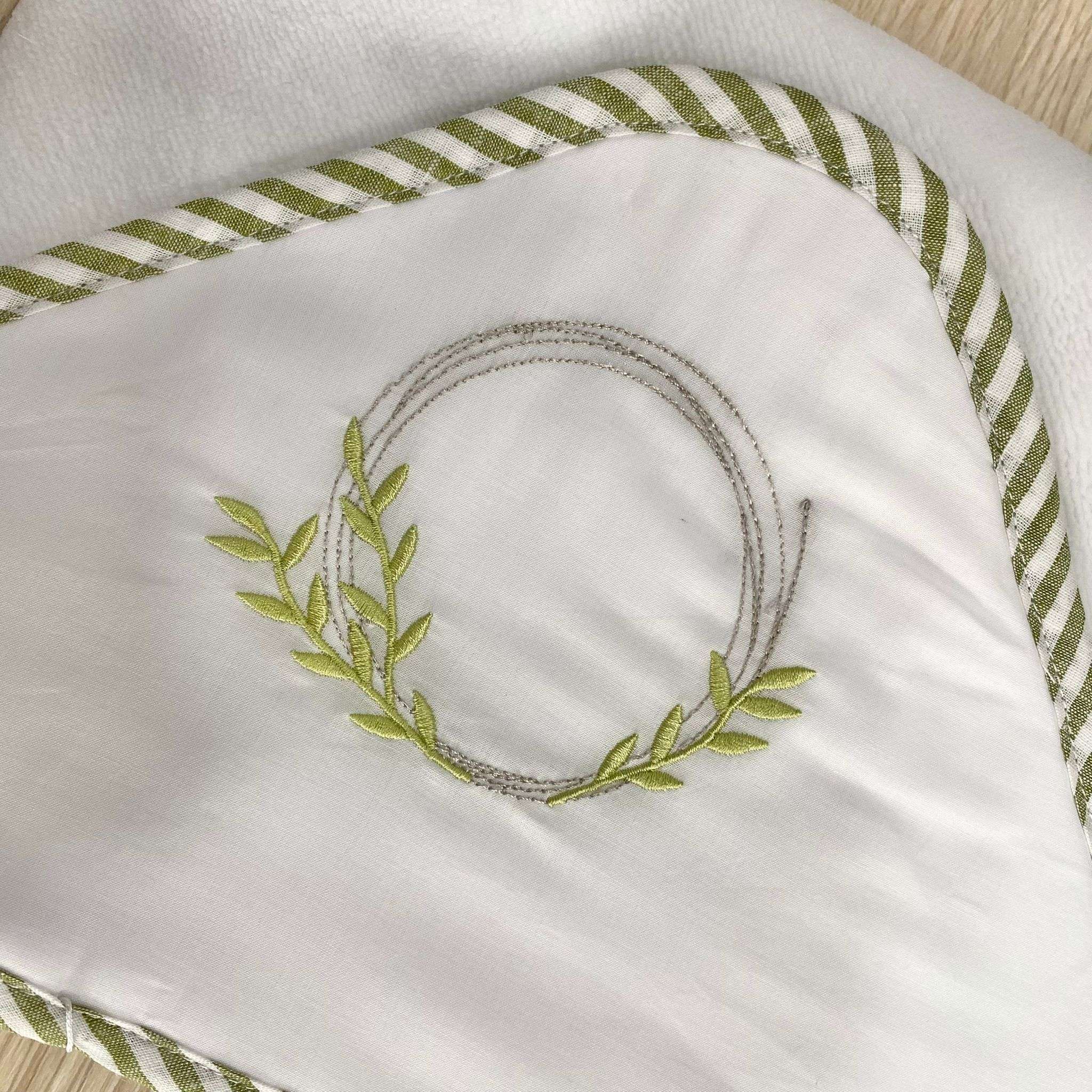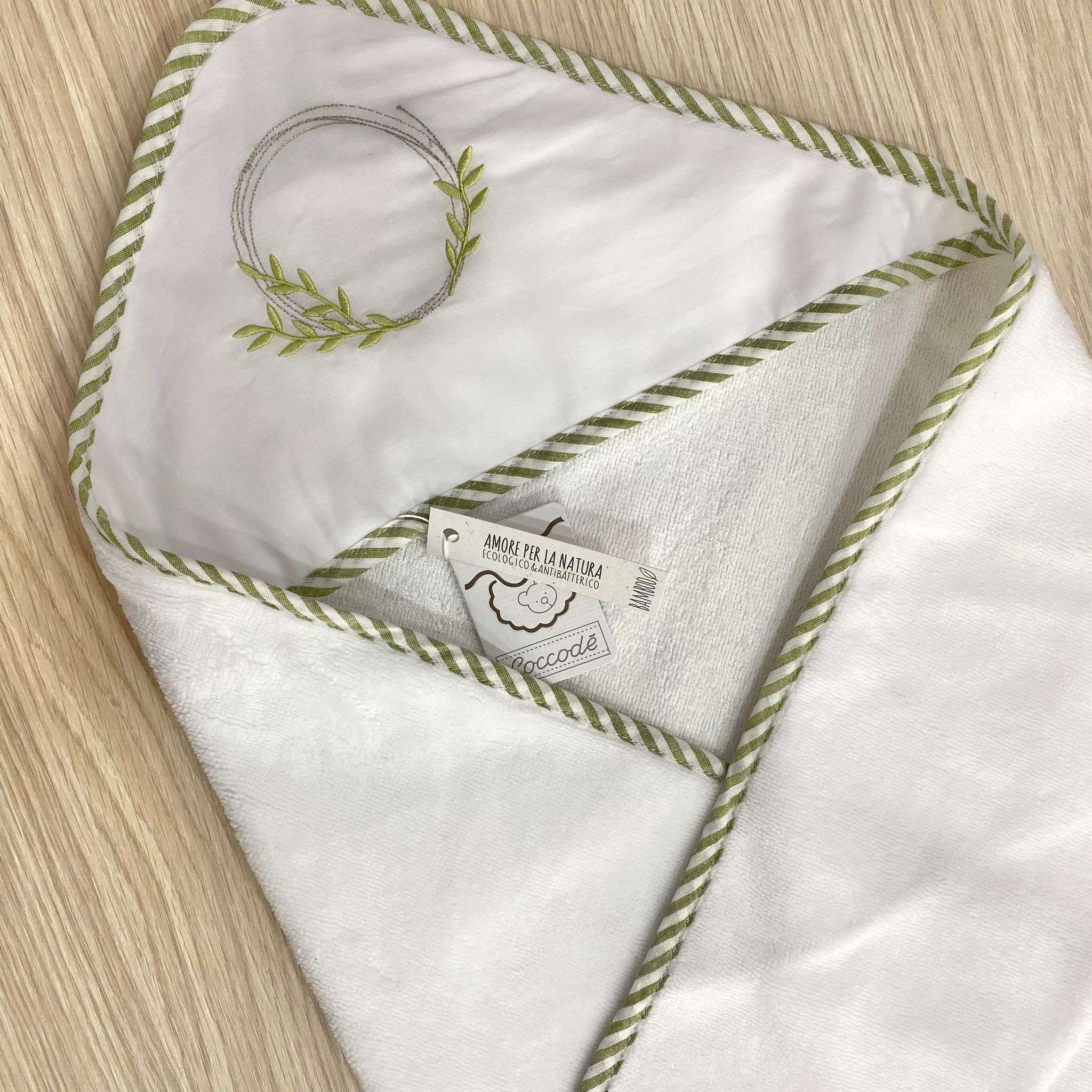 Accappatoio triangolo neonato/a in spugna di cotone, di colore bianco e verde foglia, con disegno ricamato.