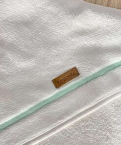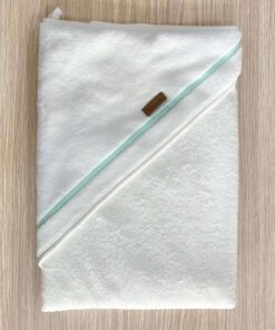 Accappatoio triangolo neonato in spugna di cotone cinigliato, di colore panna e turchese.