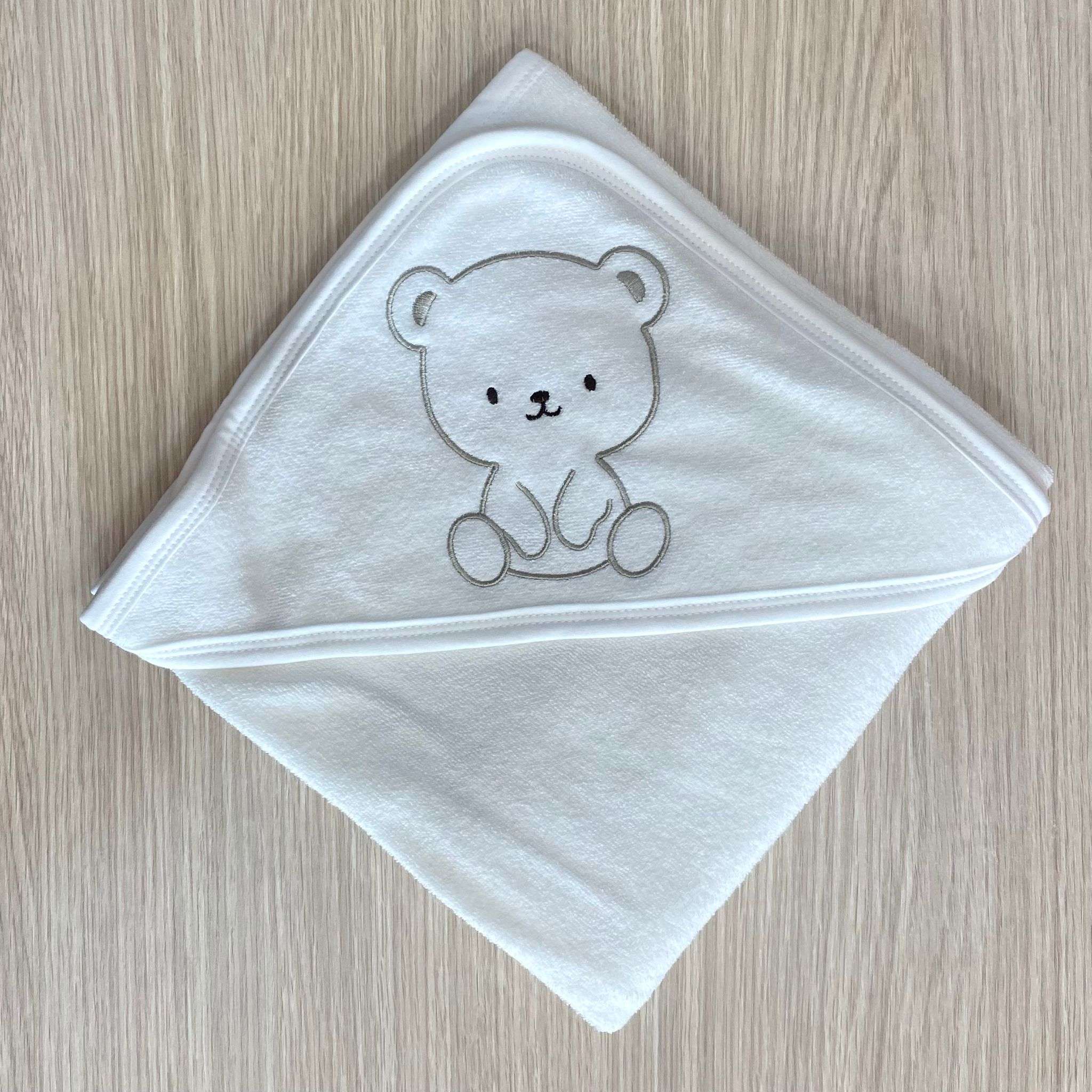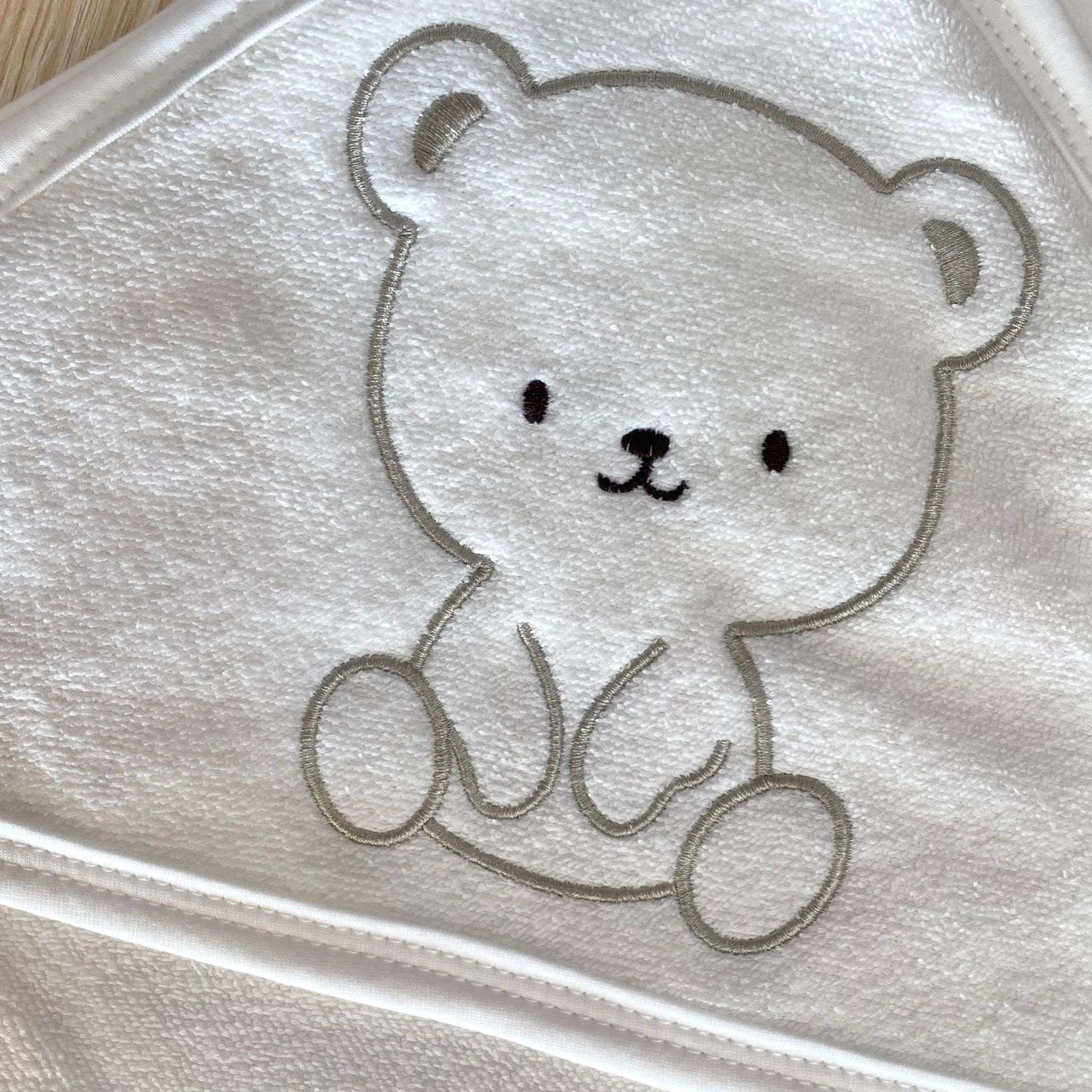 Accappatoio triangolo neonato/a in spugna di cotone, di colore panna, con disegno ricamato di colore beige.