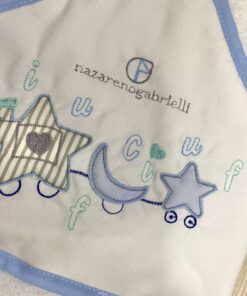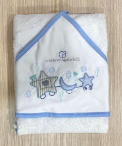 Accappatoio triangolo neonato in spugna di cotone, di colore bianco e azzurro con disegni ricamati.