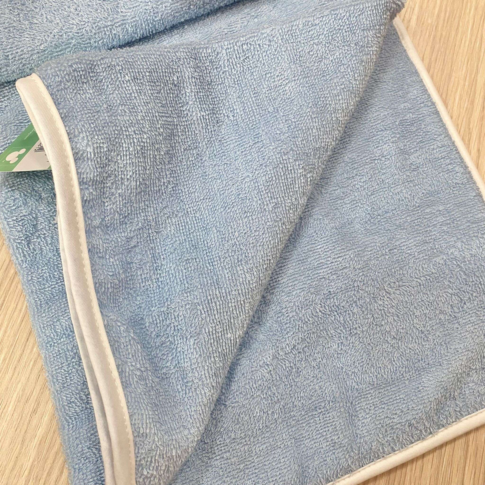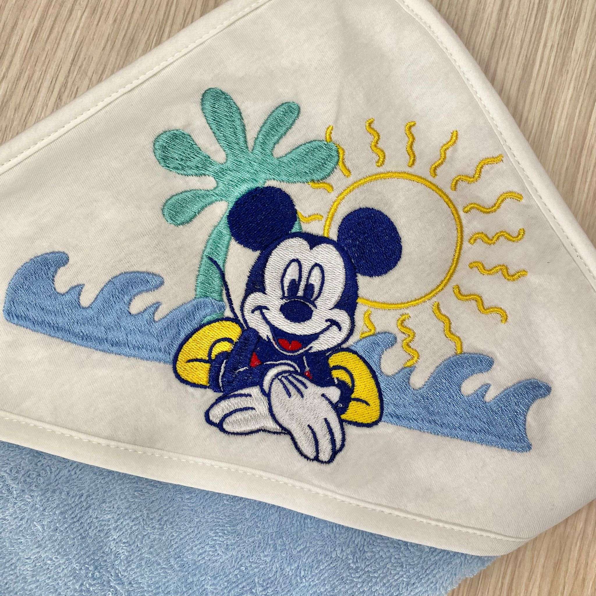 Accappatoio triangolo neonato in spugna di cotone di colore azzurro e bianco, con ricamo Mickey Mouse.
