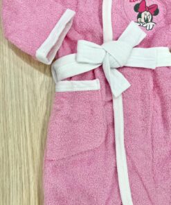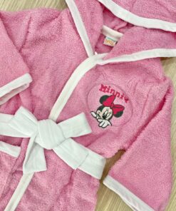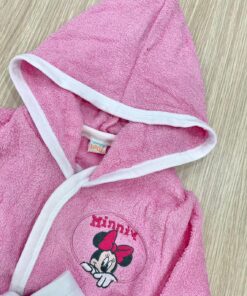 Accappatoio bambina in morbida spugna in cotone di colore rosa e bianco con dettaglio di ricamo Minnie.
