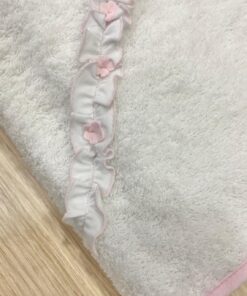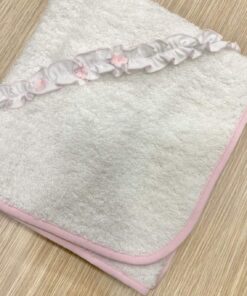 Asciugamano neonata in morbida spugna di cotone, di colore bianco e rosa, con applicazione di fiorellino.