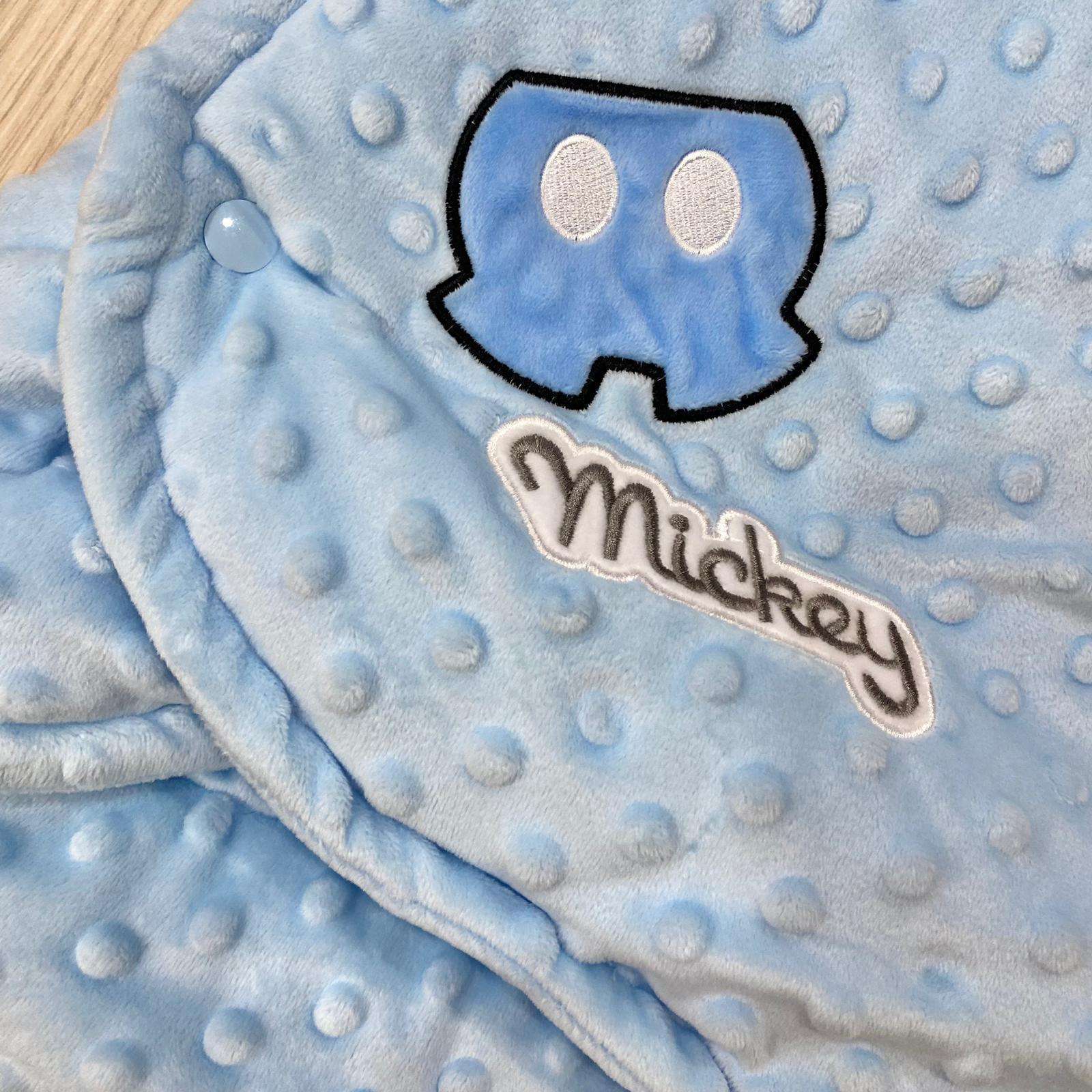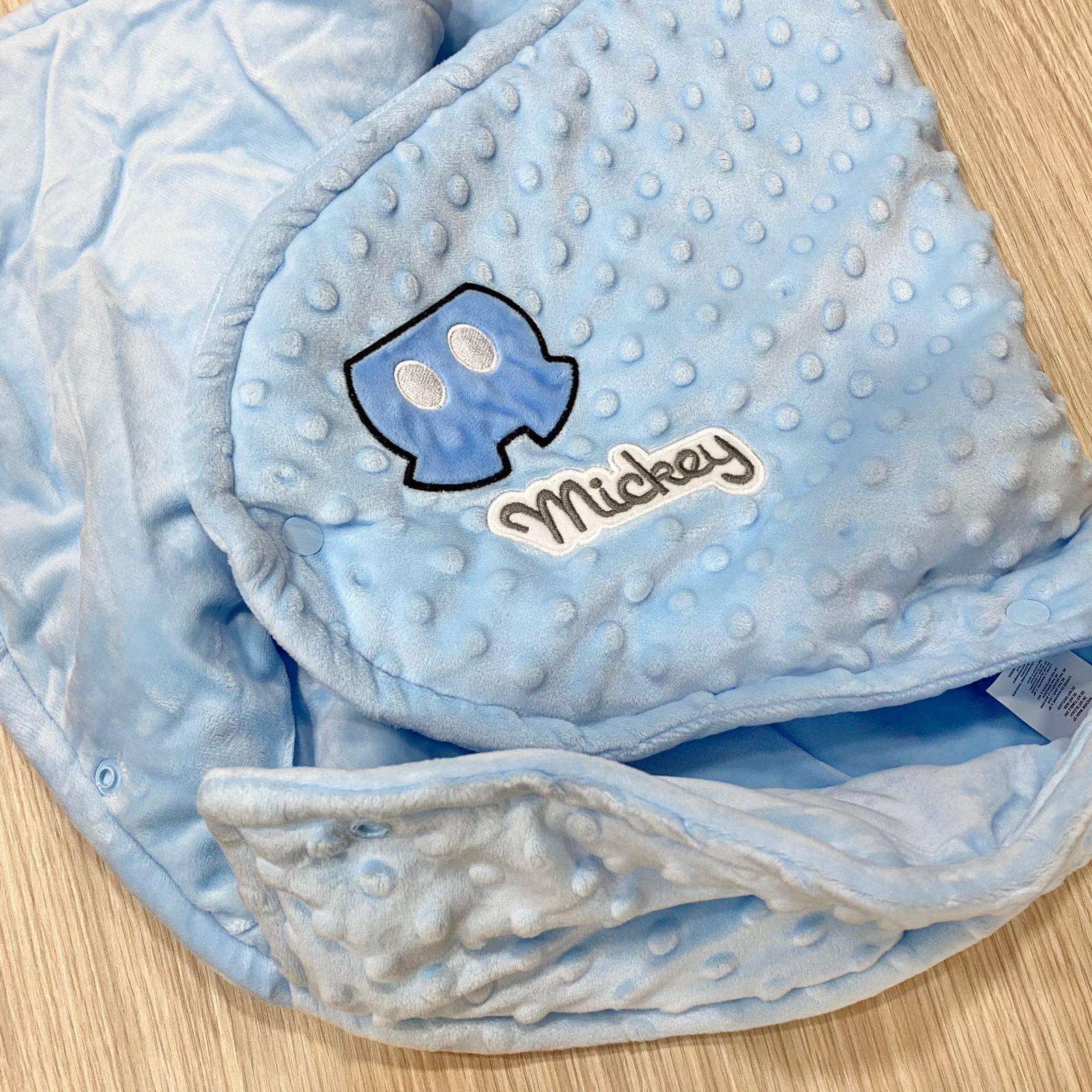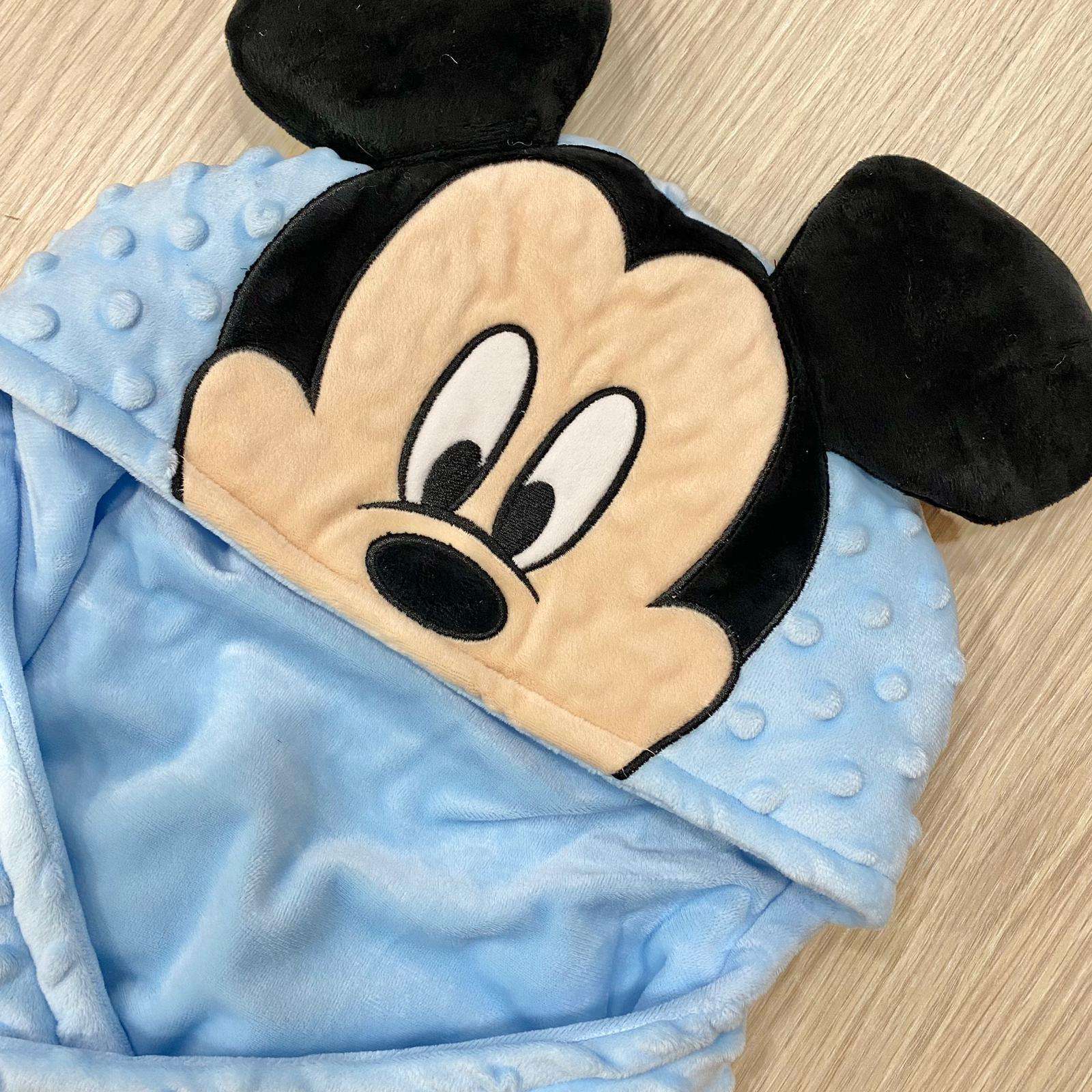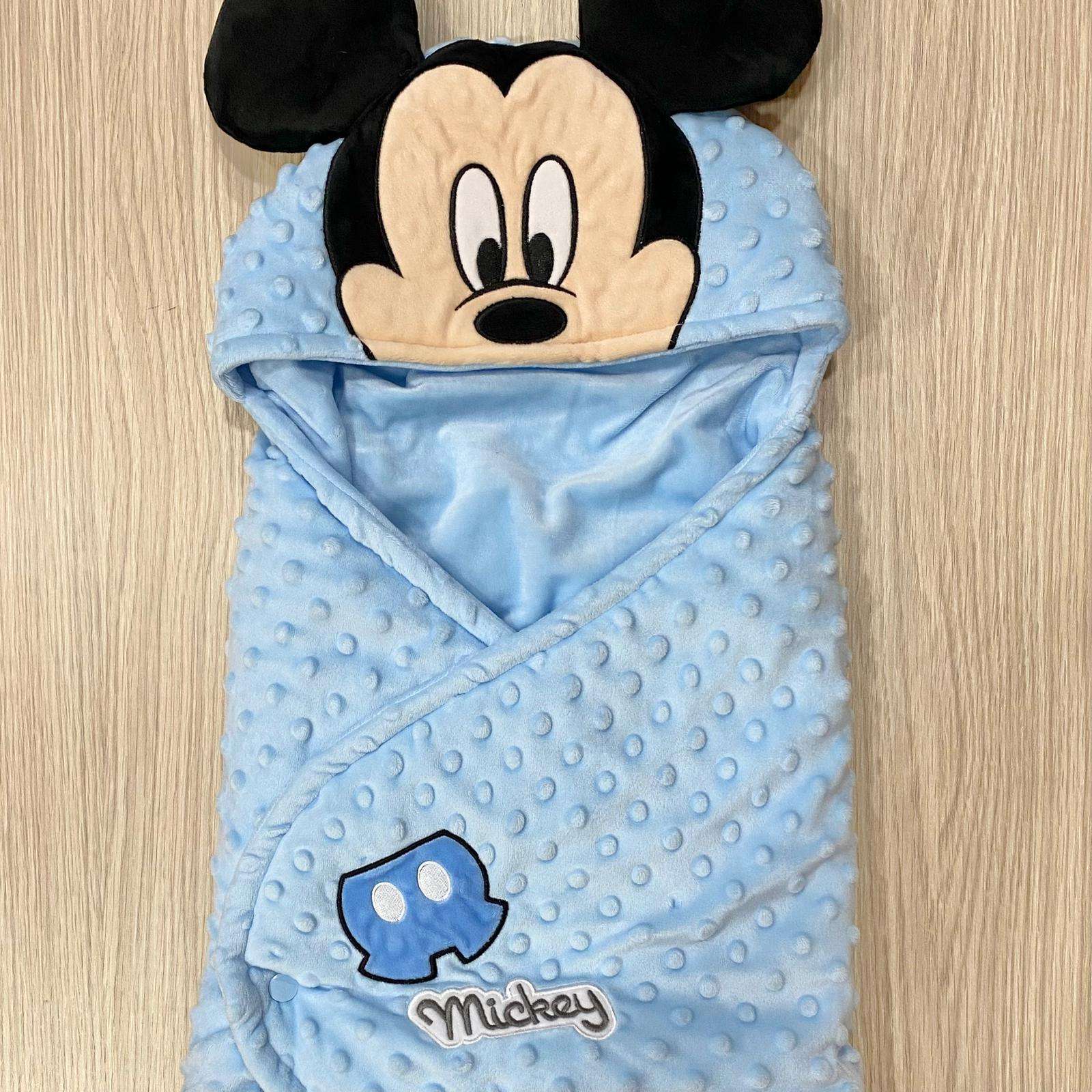 Baby sacco neonato/bambino in pile cinigliato, di colore azzurro con dettaglio Mickey Mouse.