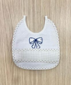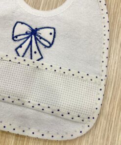 Bavetta da ricamo neonato/a in spugna di cotone, di colore bianco e blu con applicazione di tela aida.