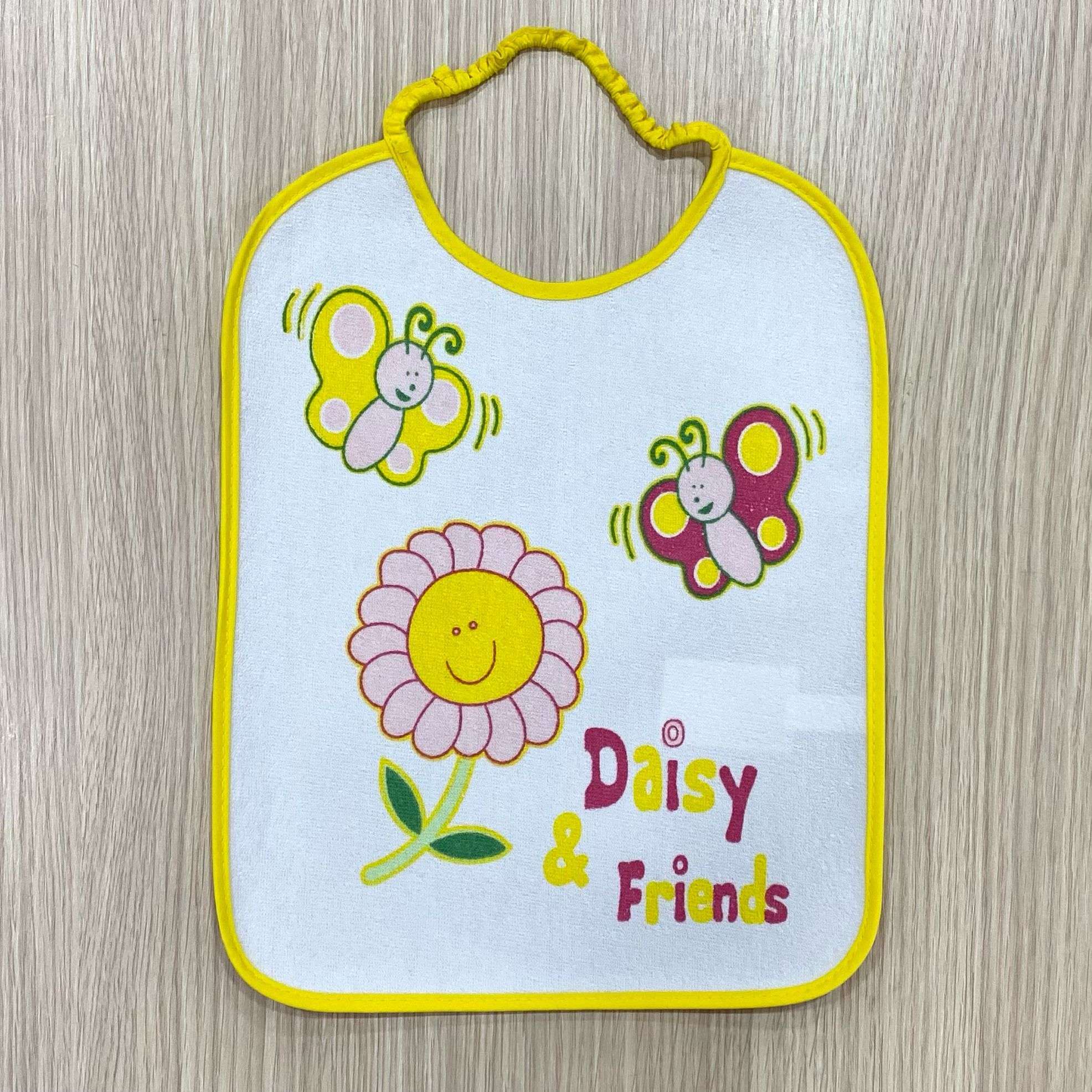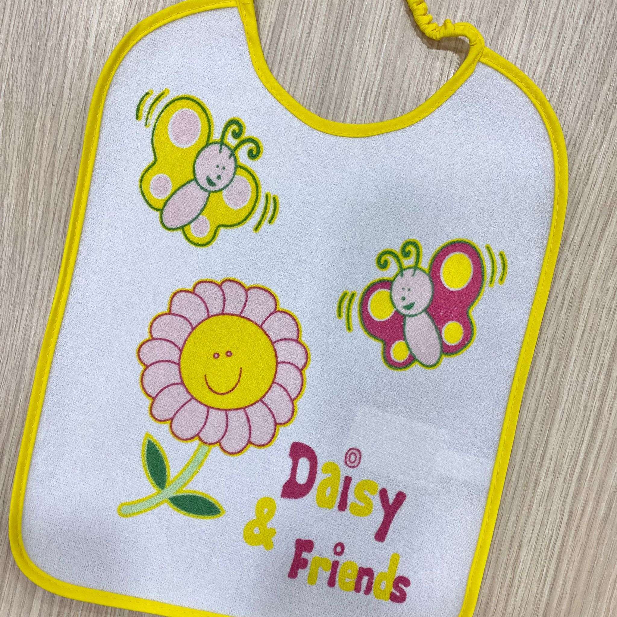 Bavetta grande plastificata neonata di colore bianco con bordini giallo e stampa di un fiorellino e di farfalline con scritta.