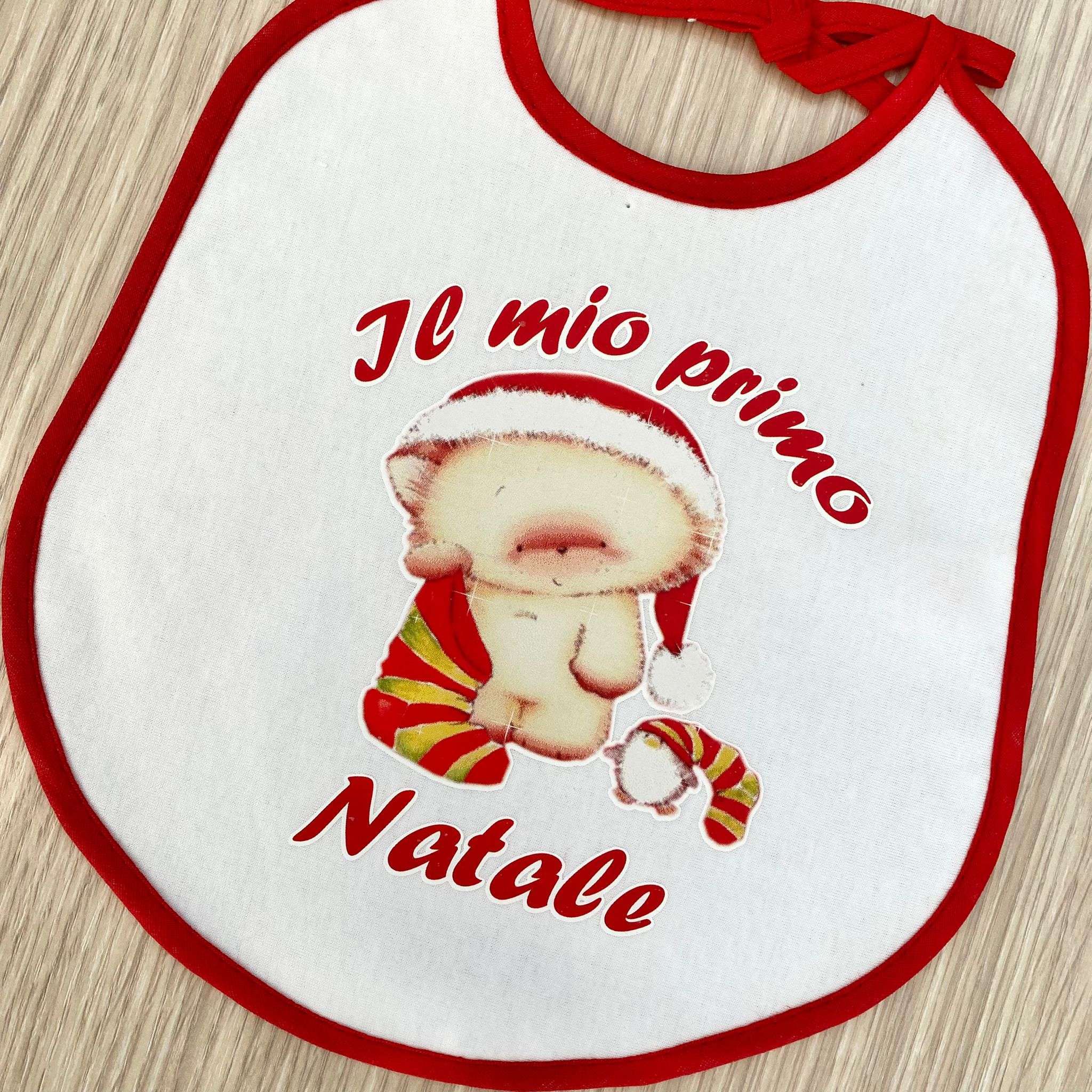 Bavetta neonato/a in cotone, di colore bianco e rosso con disegno e scritta “Il mio primo Natale” di vari colori.