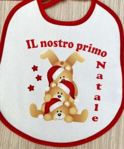 Bavetta neonato/a in cotone, di colore bianco e rosso con disegno e scritta “Il nostro primo Natale” di vari colori.