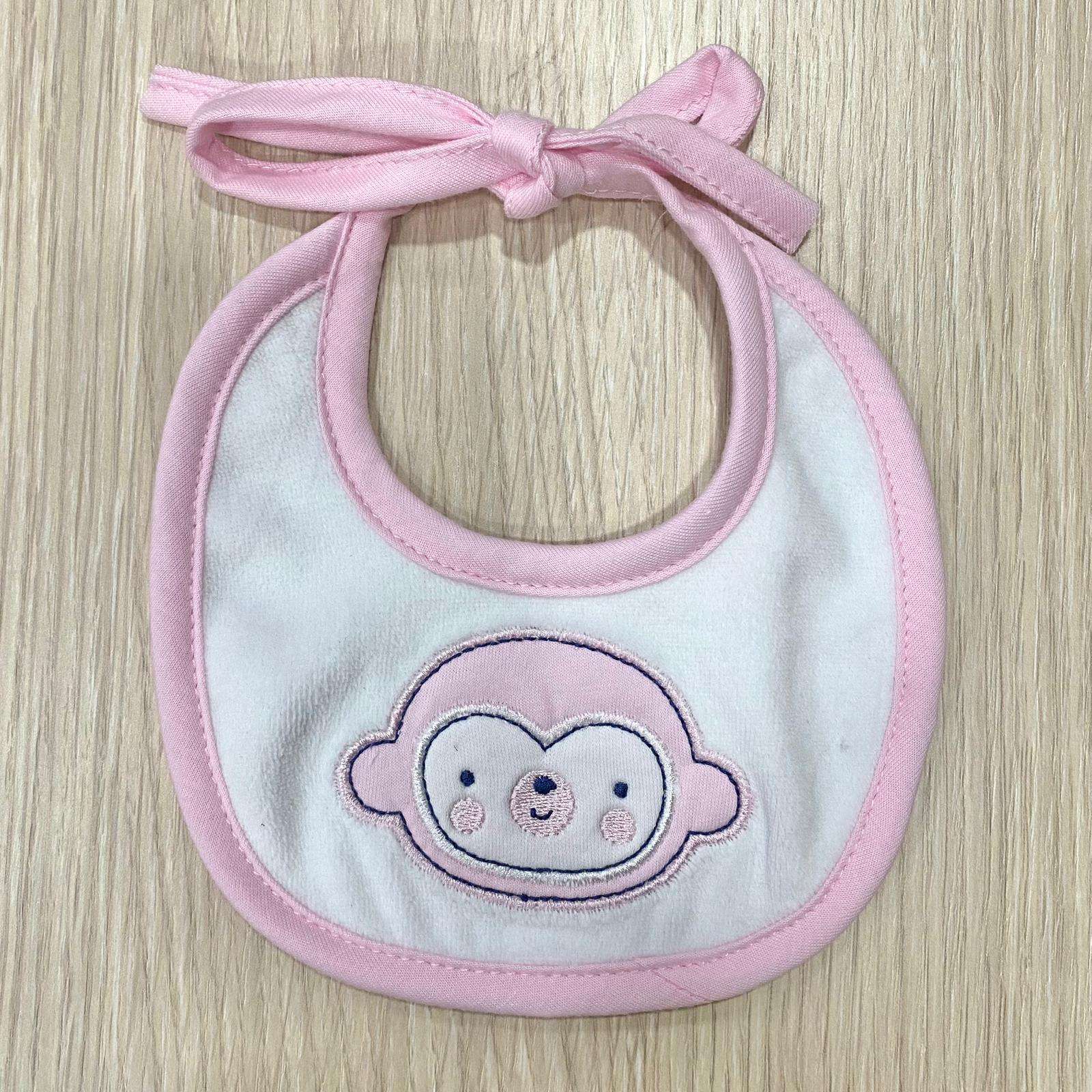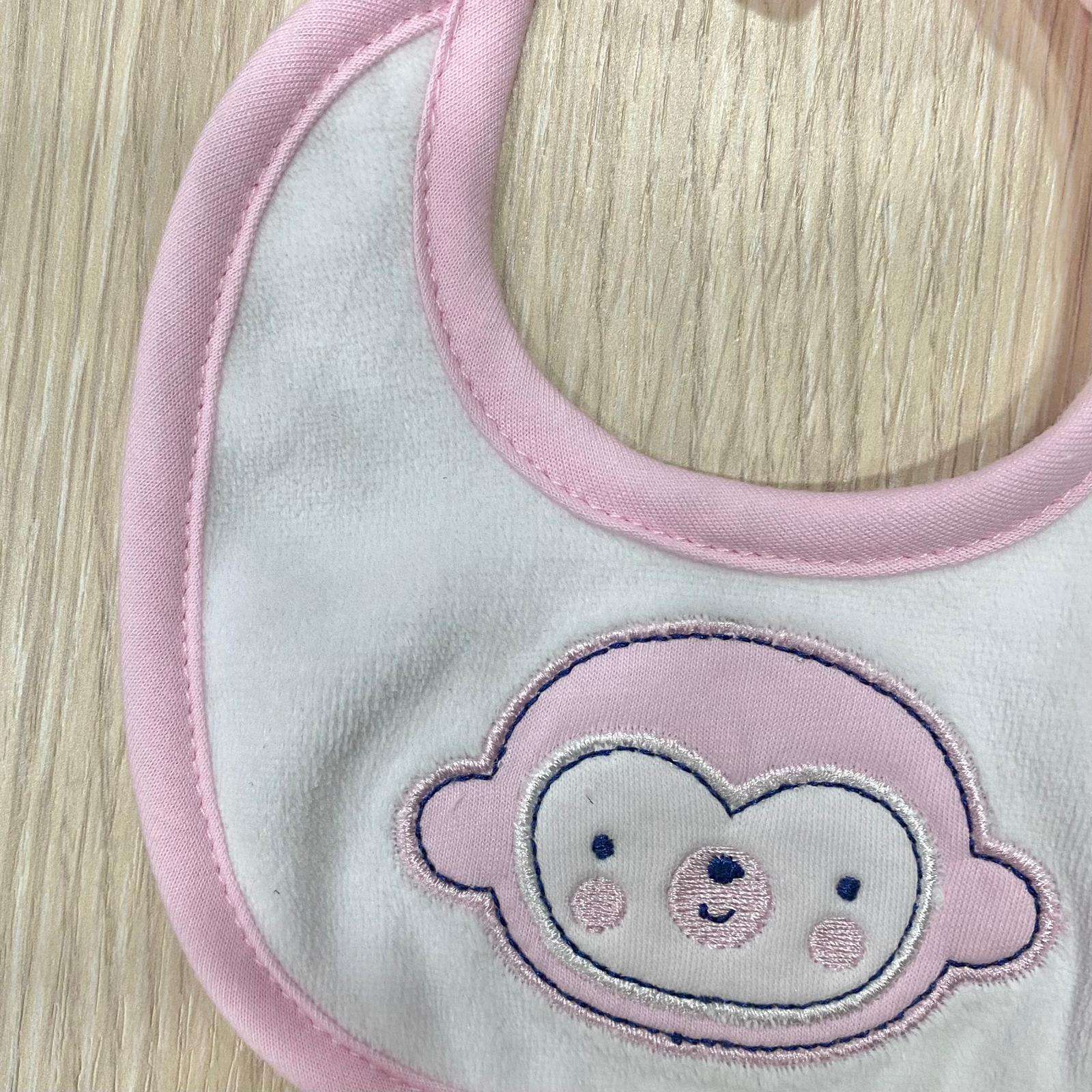 Bavetta neonata in cotone cinigliato, di colore bianco e rosa, con disegno ricamato.
