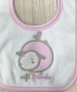 Bavetta neonata in cotone cinigliato, di colore bianco e rosa, con disegno ricamato.