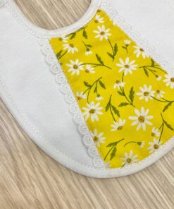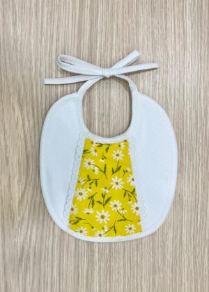 Bavetta neonata in cotone, di colore bianco e giallo con disegno di fiorellini.