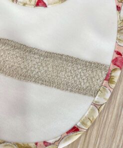 Bavetta neonata in cotone, di colore panna, beige e rosso, con disegni floreali e dettaglio di retina in cotone.