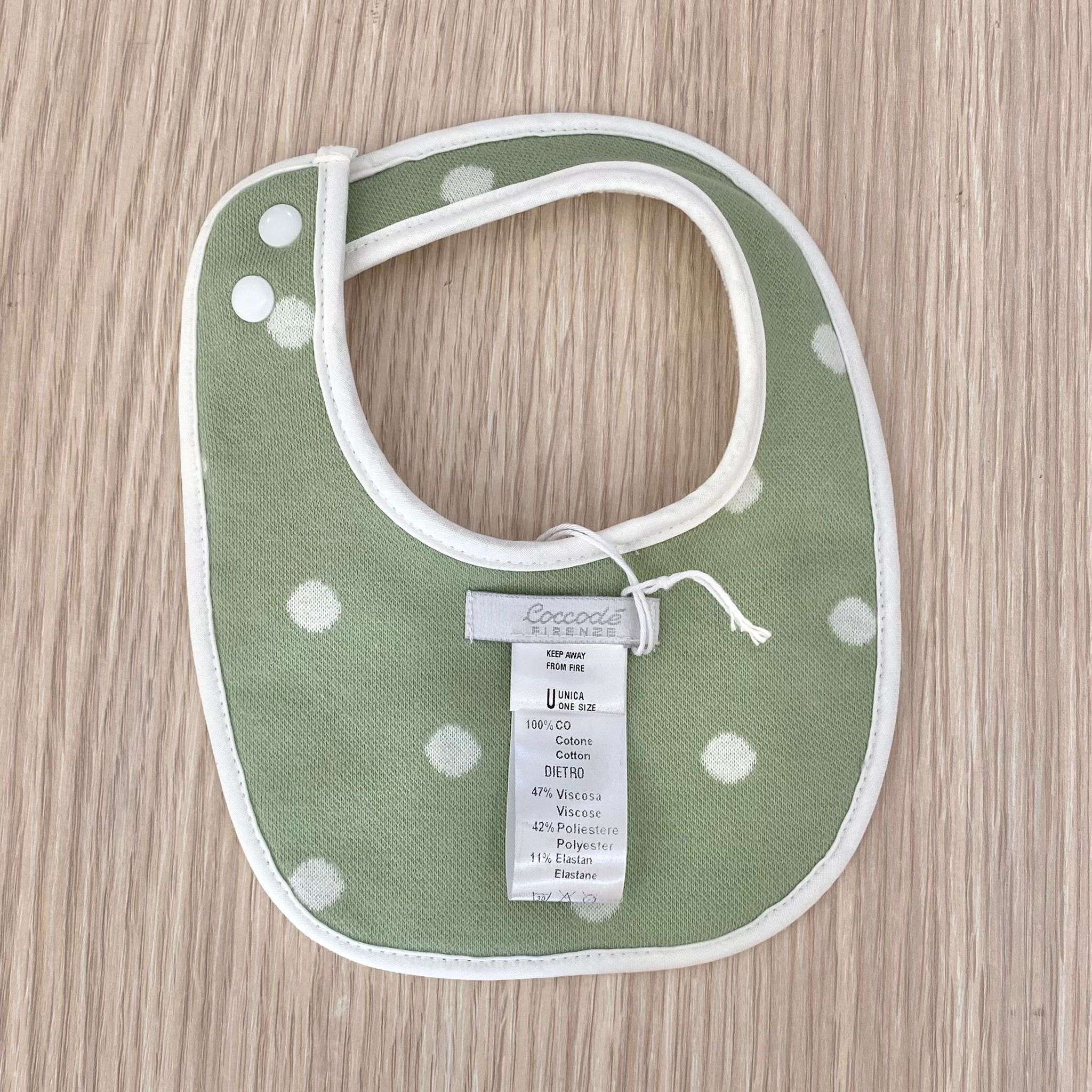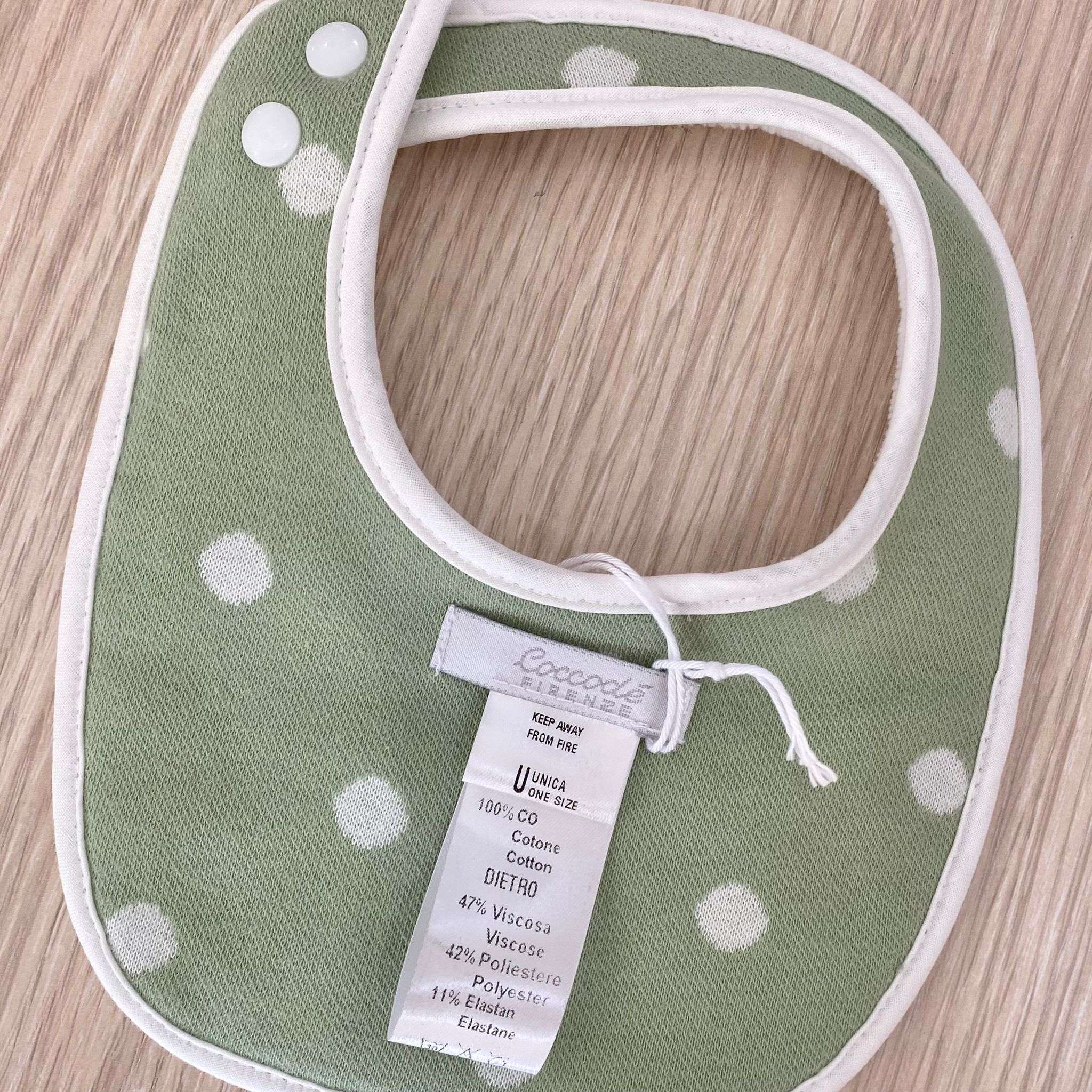 Bavetta neonata in spugna cimata di bamboo, di colore verde aloe e panna.