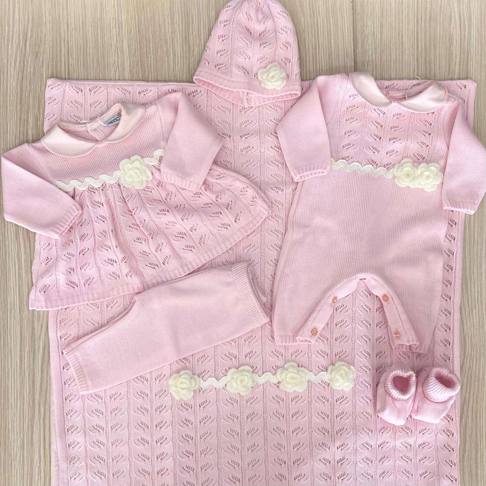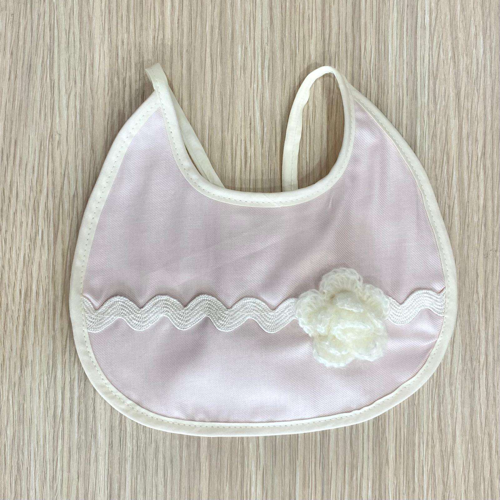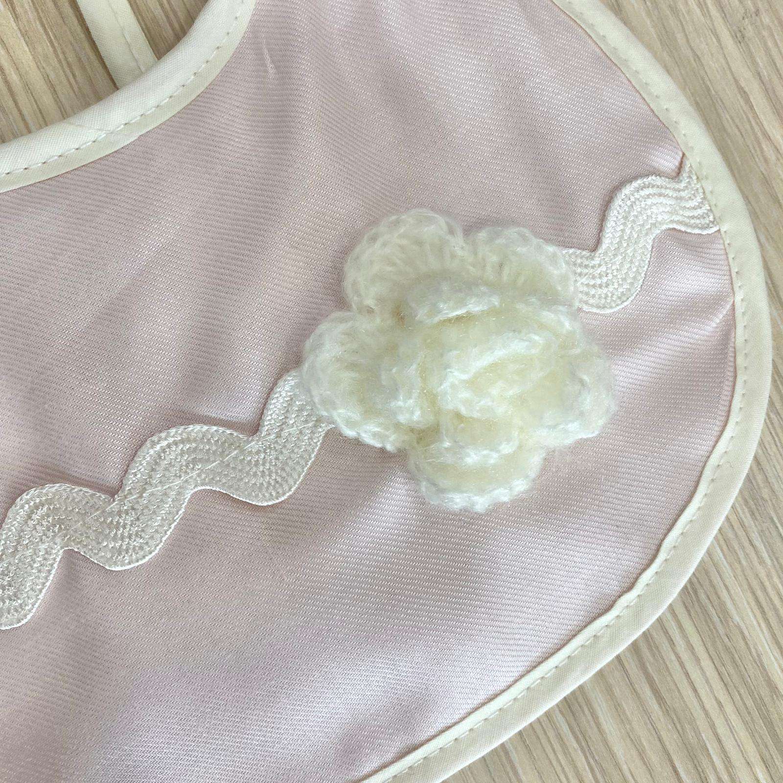 Bavetta neonata in cotone, di colore rosa e panna, con applicazione di fiorellino in rilievo.