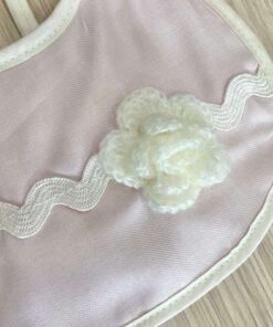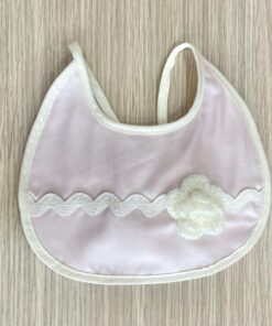 Bavetta neonata in cotone, di colore rosa e panna, con applicazione di fiorellino in rilievo.