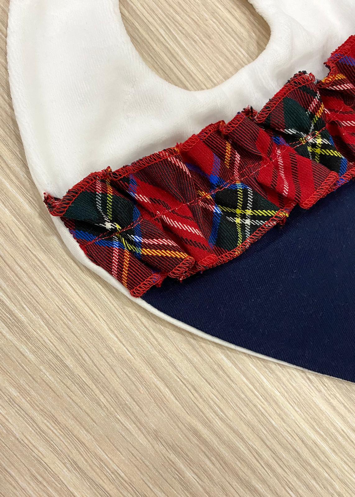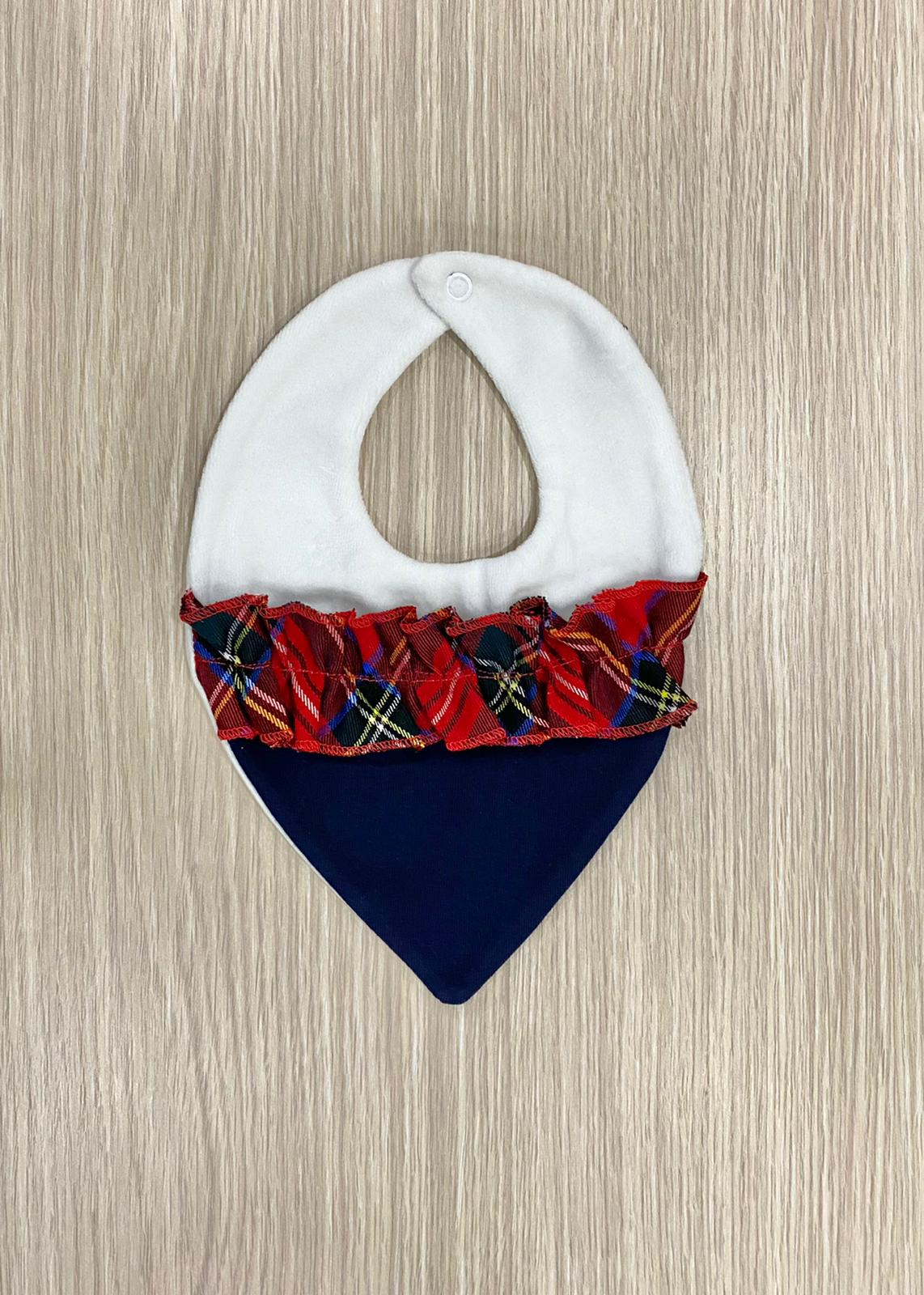 Bavetta neonata in ciniglia di cotone, di colore panna e blu, con applicazione di dettaglio di colore rosso.