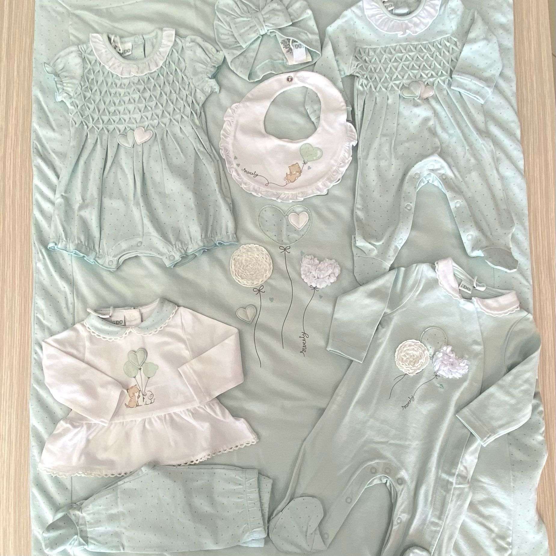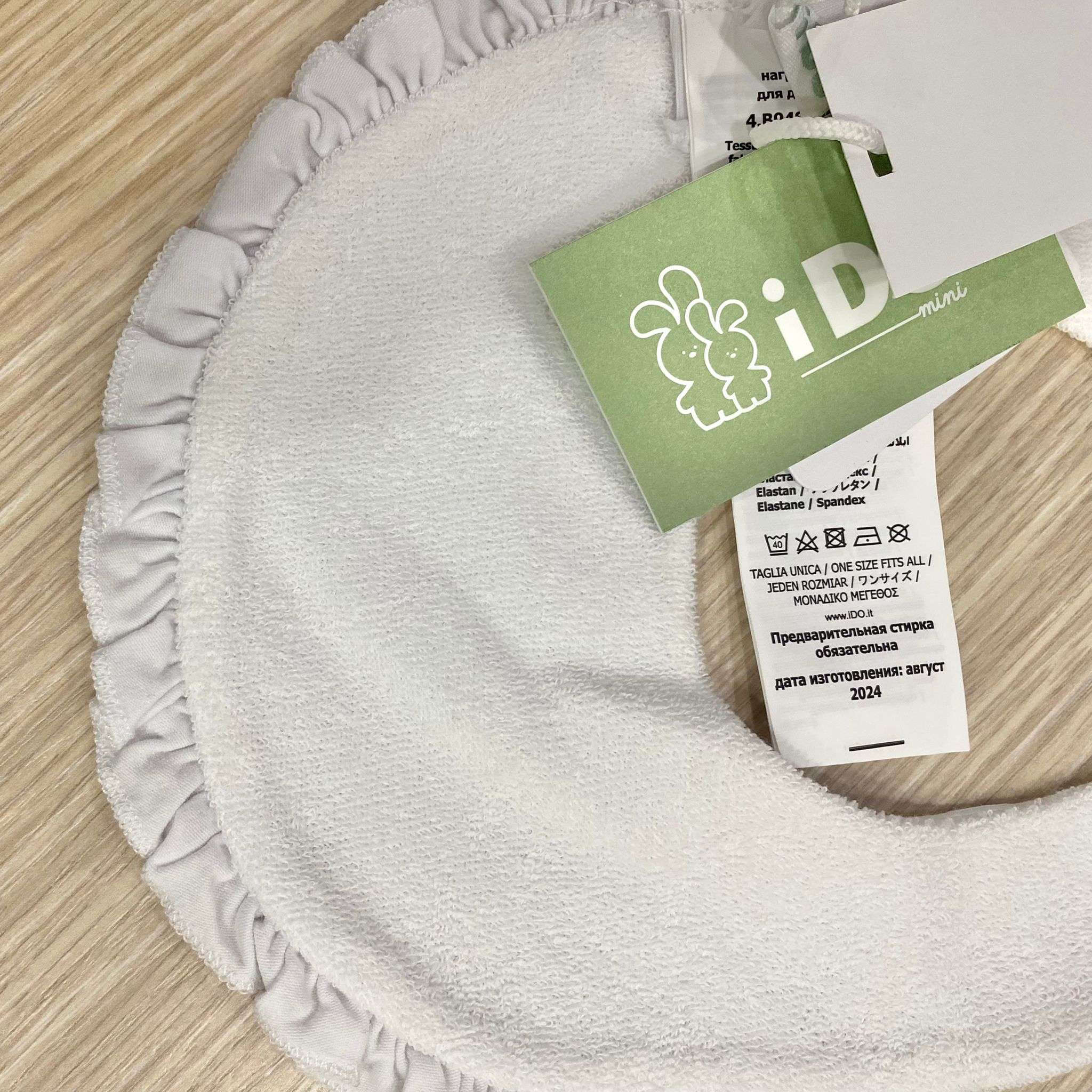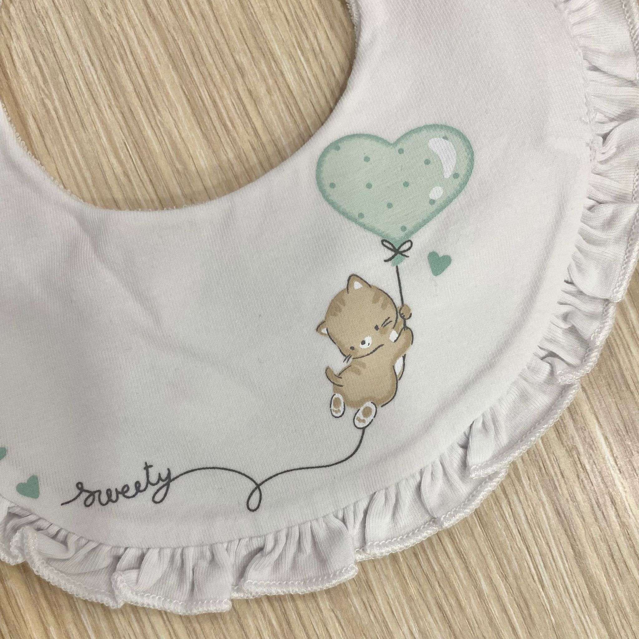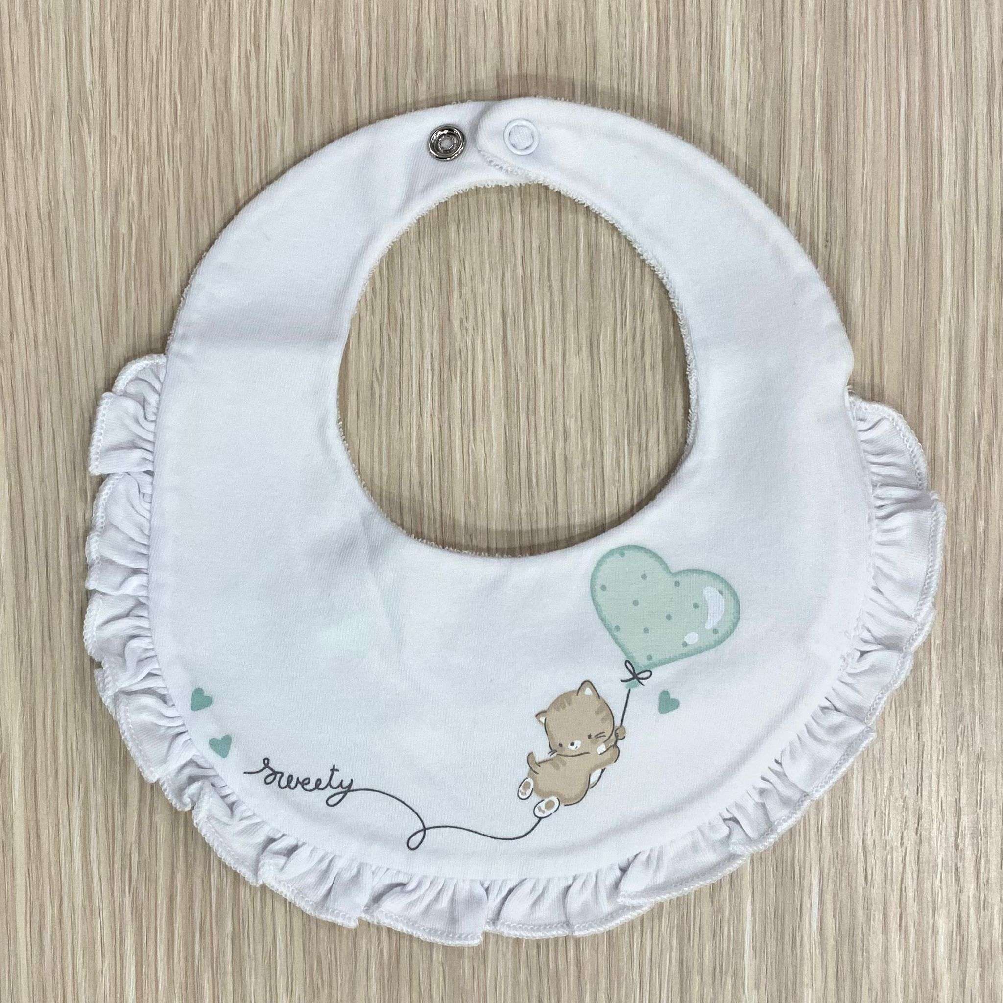 Bavetta neonata in spugna di cotone, di colore bianco e verde, con stampe di vari colori.