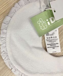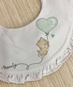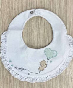 Bavetta neonata in spugna di cotone, di colore bianco e verde, con stampe di vari colori.