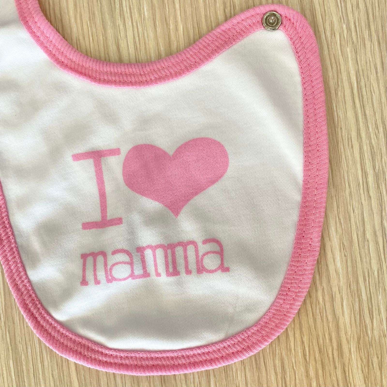 Bavetta neonata in cotone di colore bianco con bordino e scritta di colore rosa.