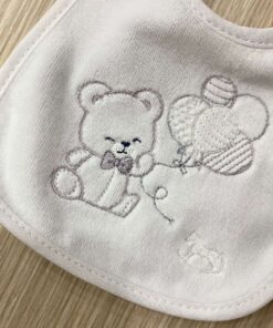 Bavetta neonato/a in morbida spugna cinigliata, di colore bianco con disegno orsetto ricamato.