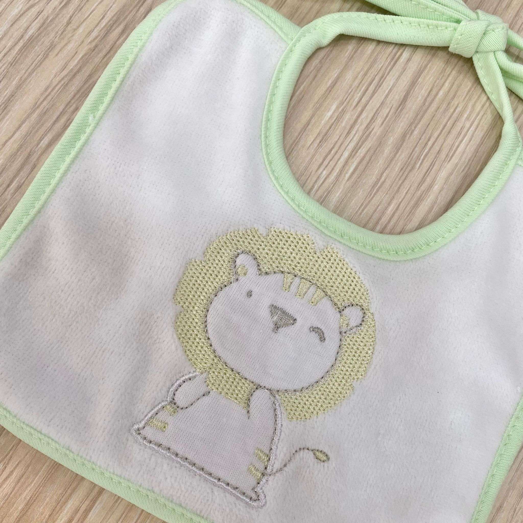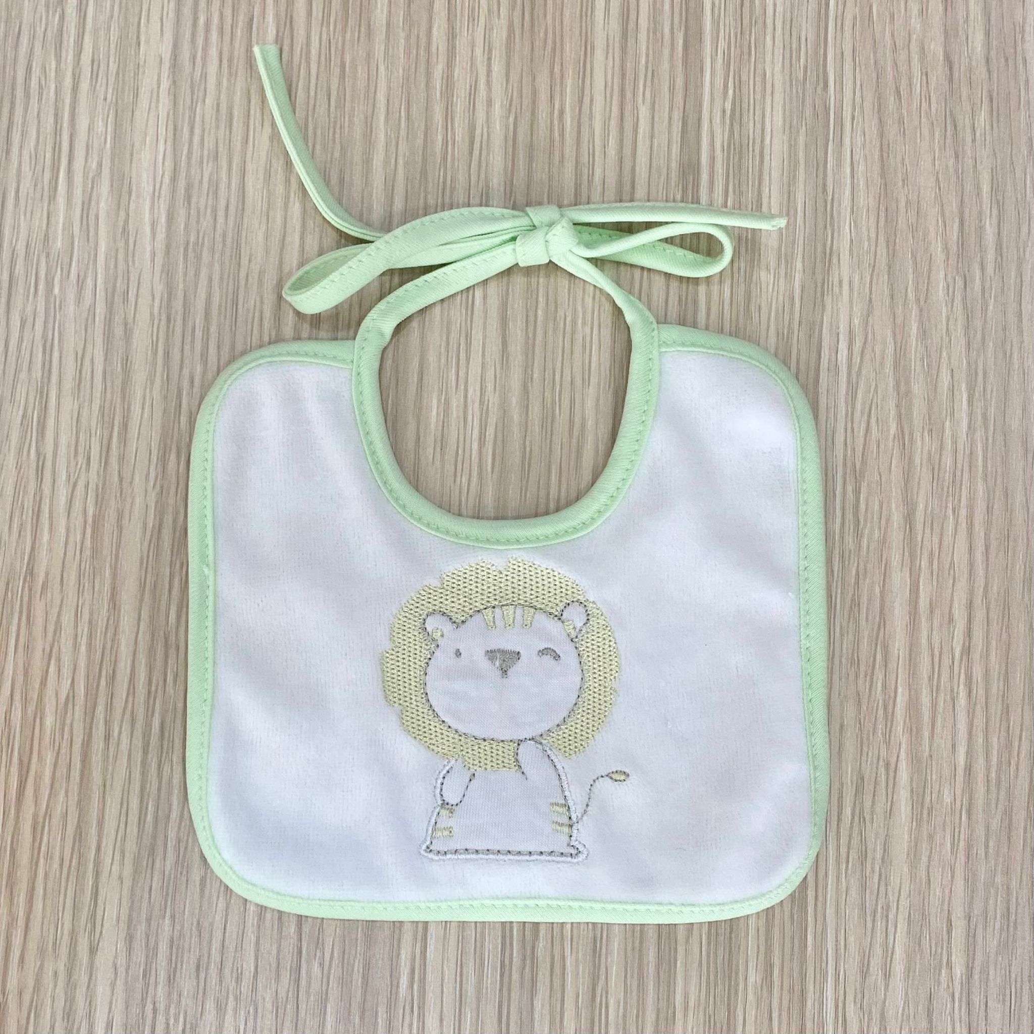 Bavetta neonato in cotone cinigliato, di colore bianco e verde chiaro, con disegno ricamato.