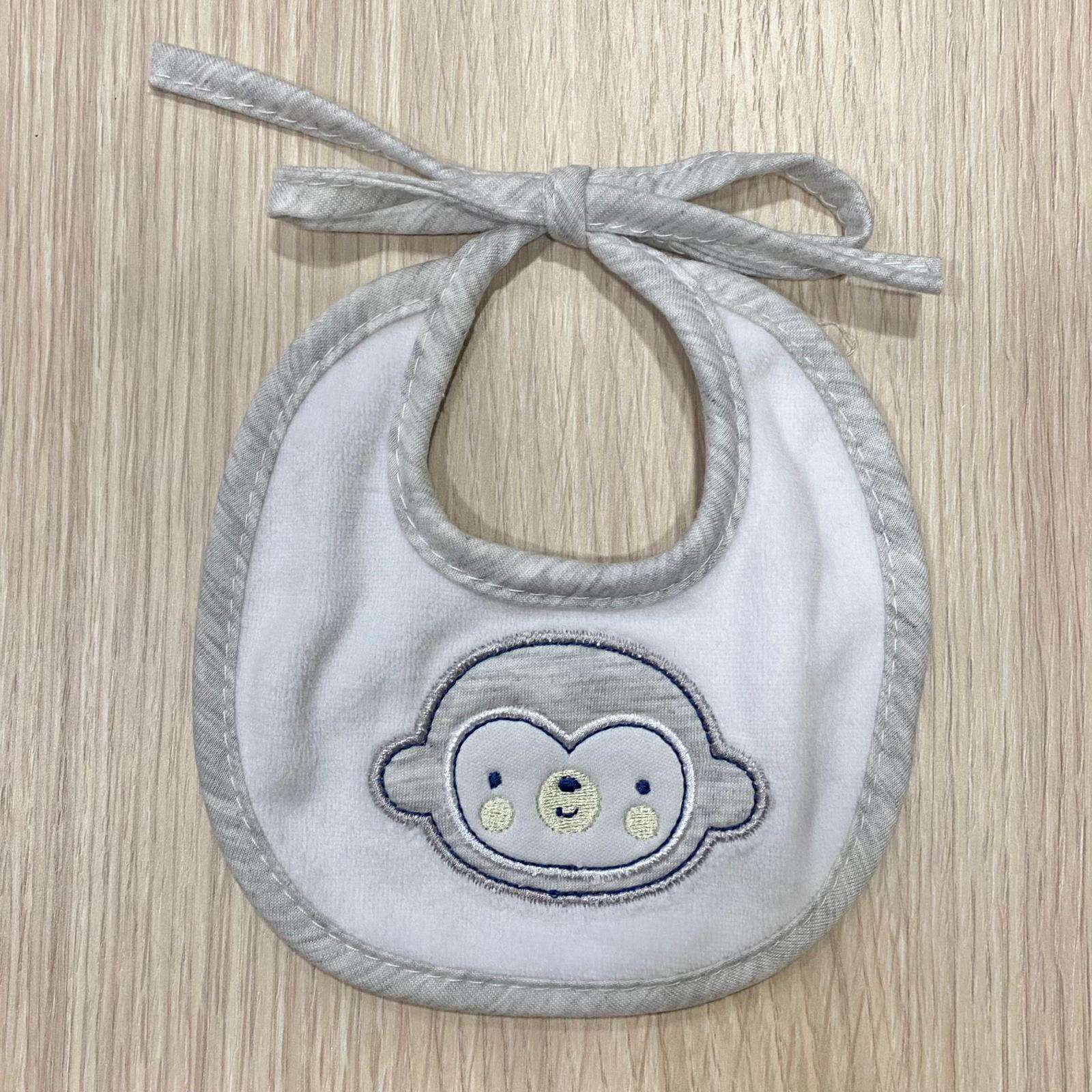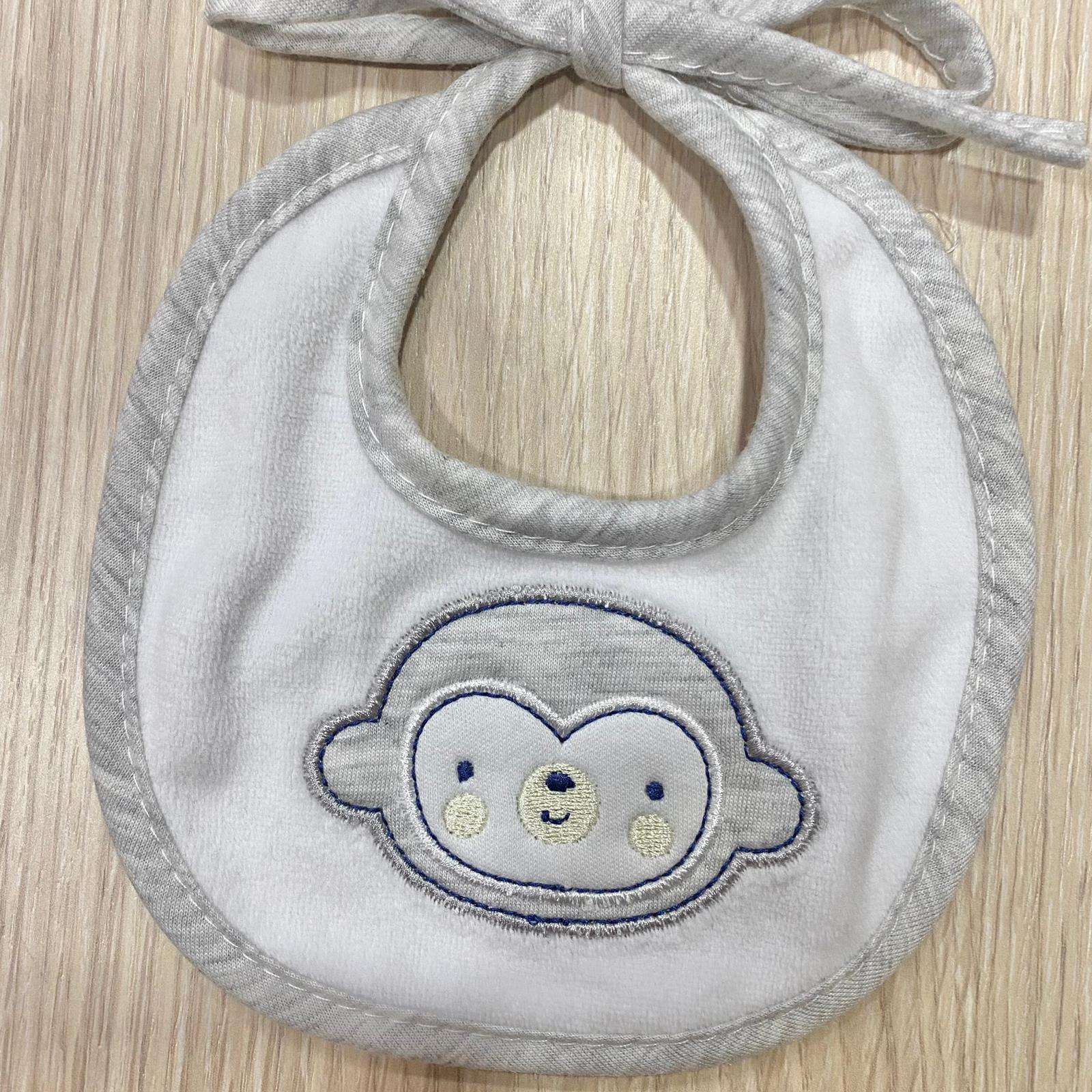 Bavetta neonato/a in cotone cinigliato, di colore bianco e grigio, con disegno ricamato.