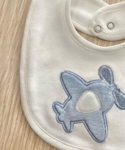 Bavetta neonato in cotone, di colore panna e celeste, con disegno in rilievo.