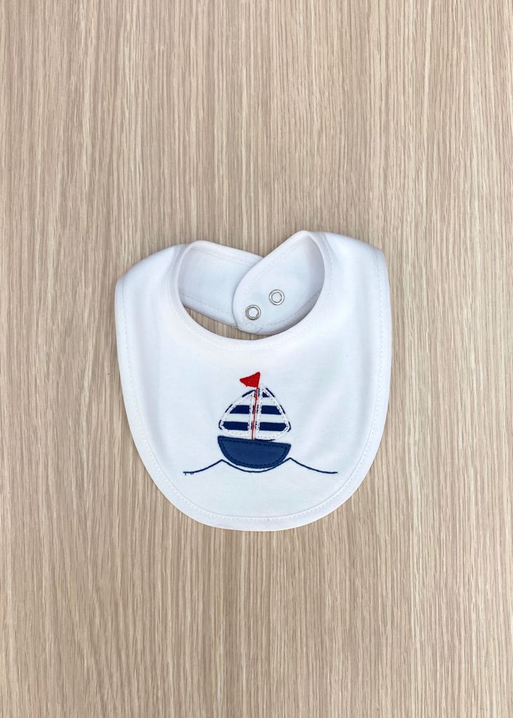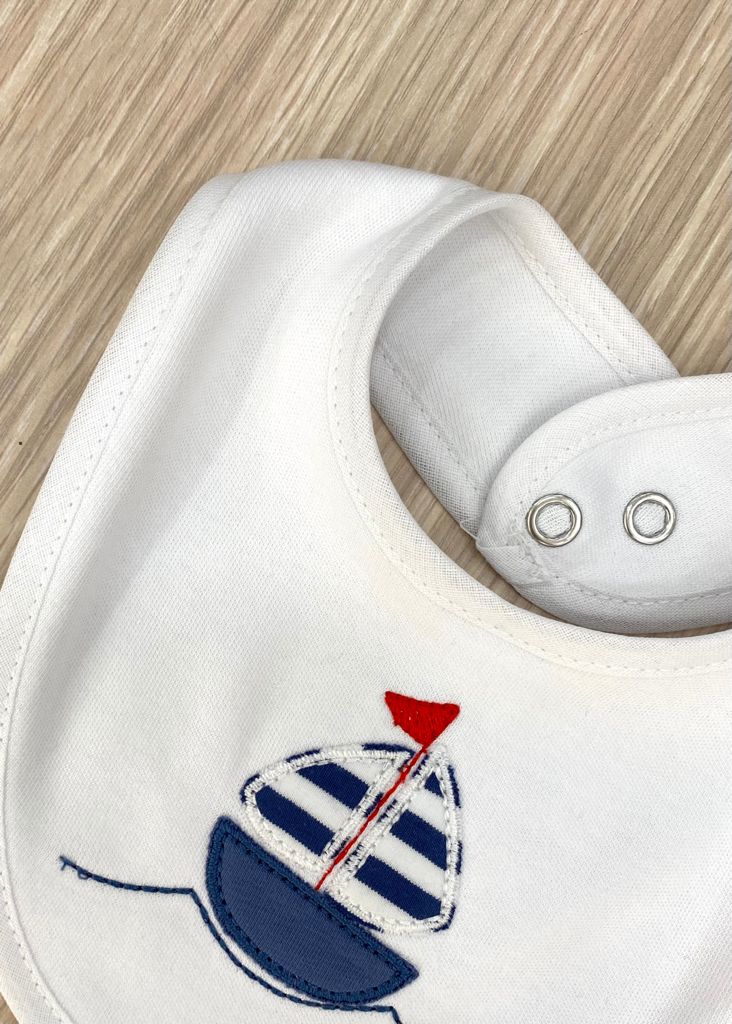 Bavetta neonato in cotone, di colore bianco con ricamo in rilievo di colore blu e rosso.