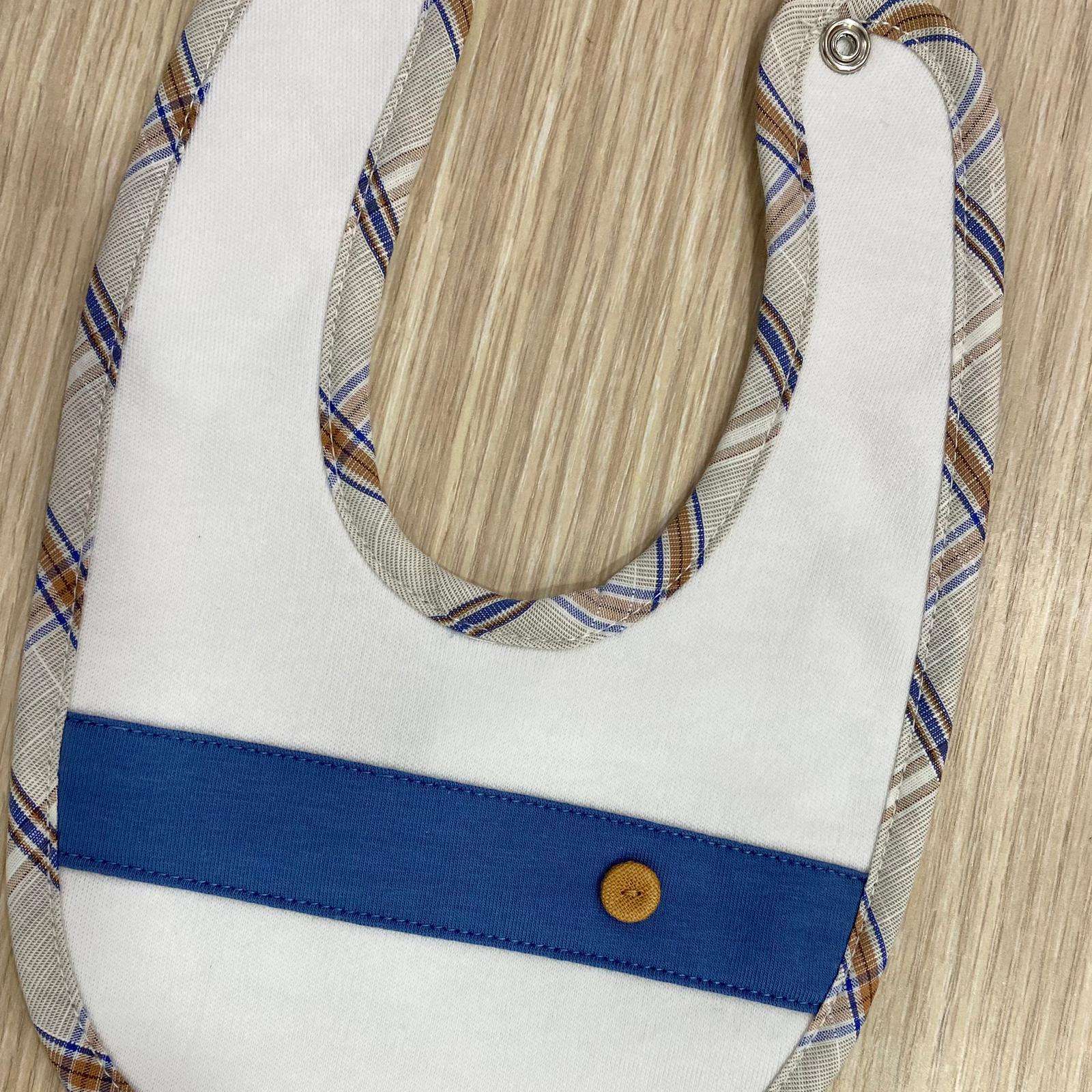 Bavetta neonato in cotone, di colore bianco e jeans, con dettagli a quadri di vari colori, con applicazione di bottoncino.
