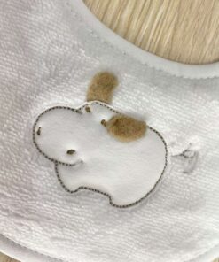 Bavetta neonato in cotone bio, di colore bianco e sabbia, con disegno ricamato.