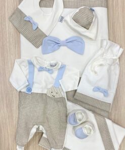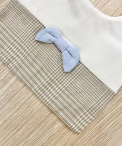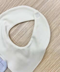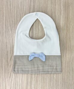 Bavetta neonato in cotone, di colore panna e sabbia con applicazione di papillon di colore azzurro.