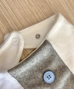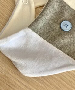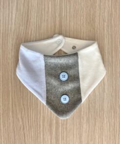 Bavetta neonato in morbida ciniglia di cotone, di colore panna, grigio e azzurro con applicazione di bottoncini.