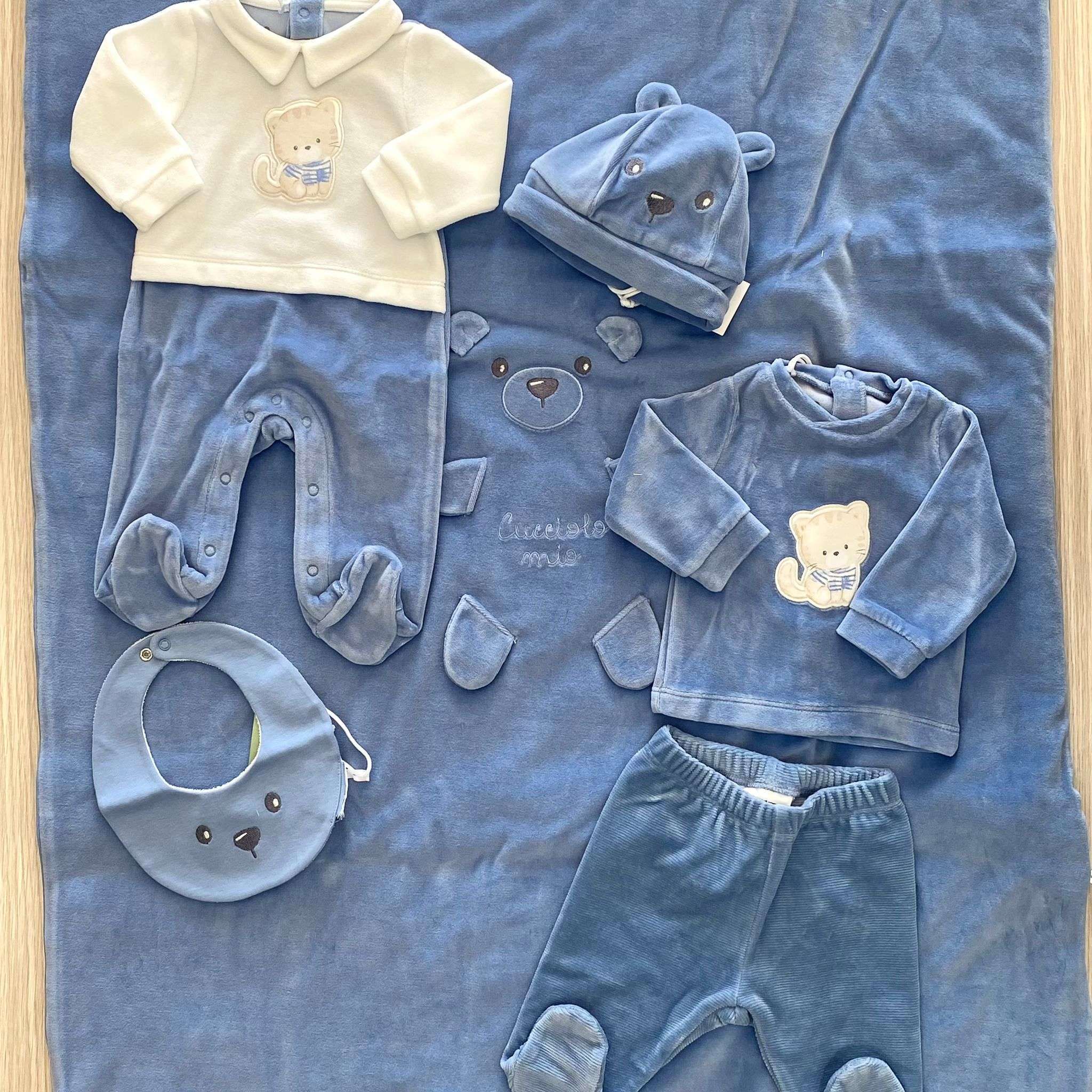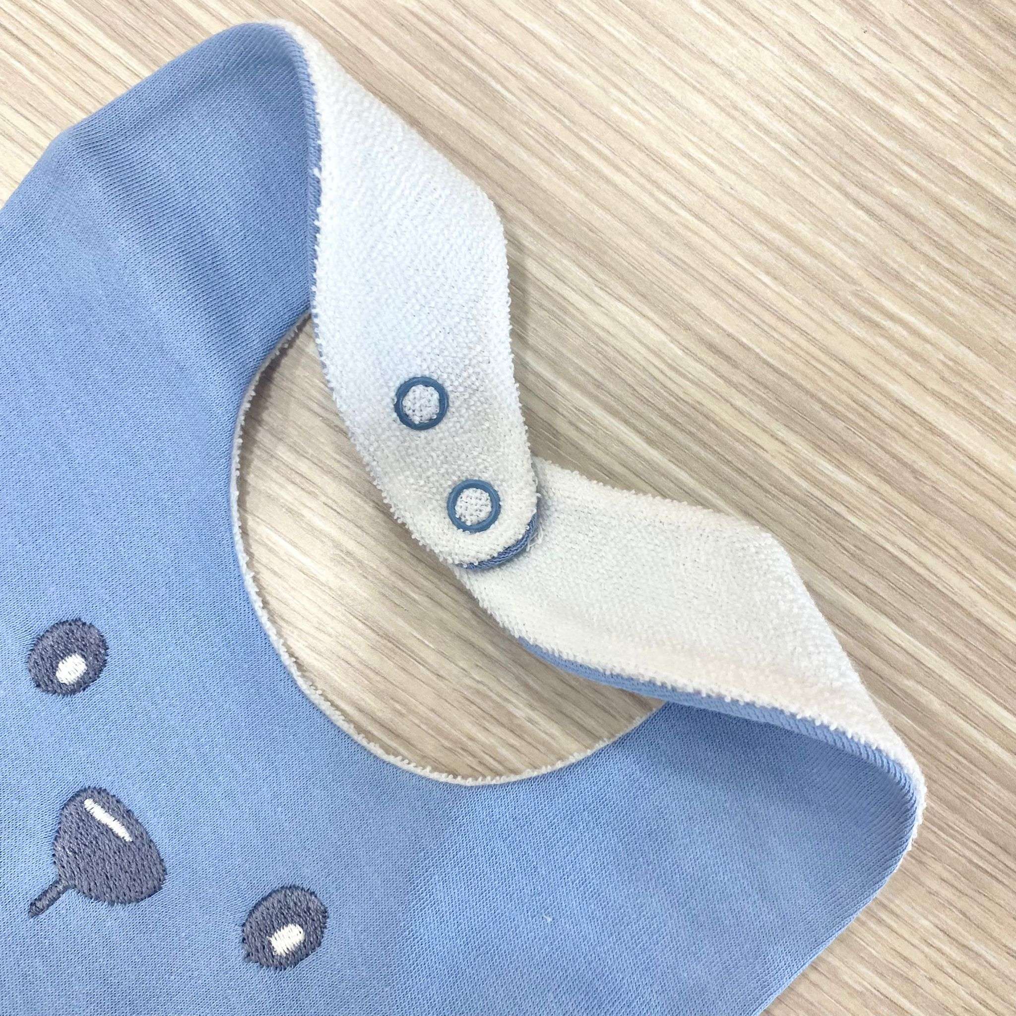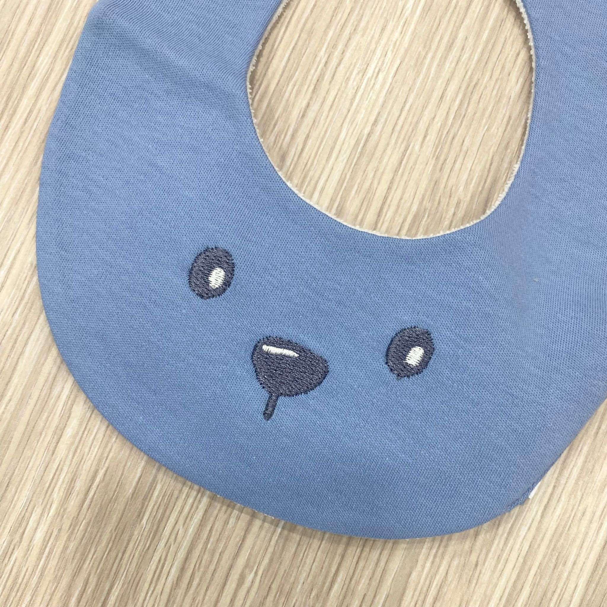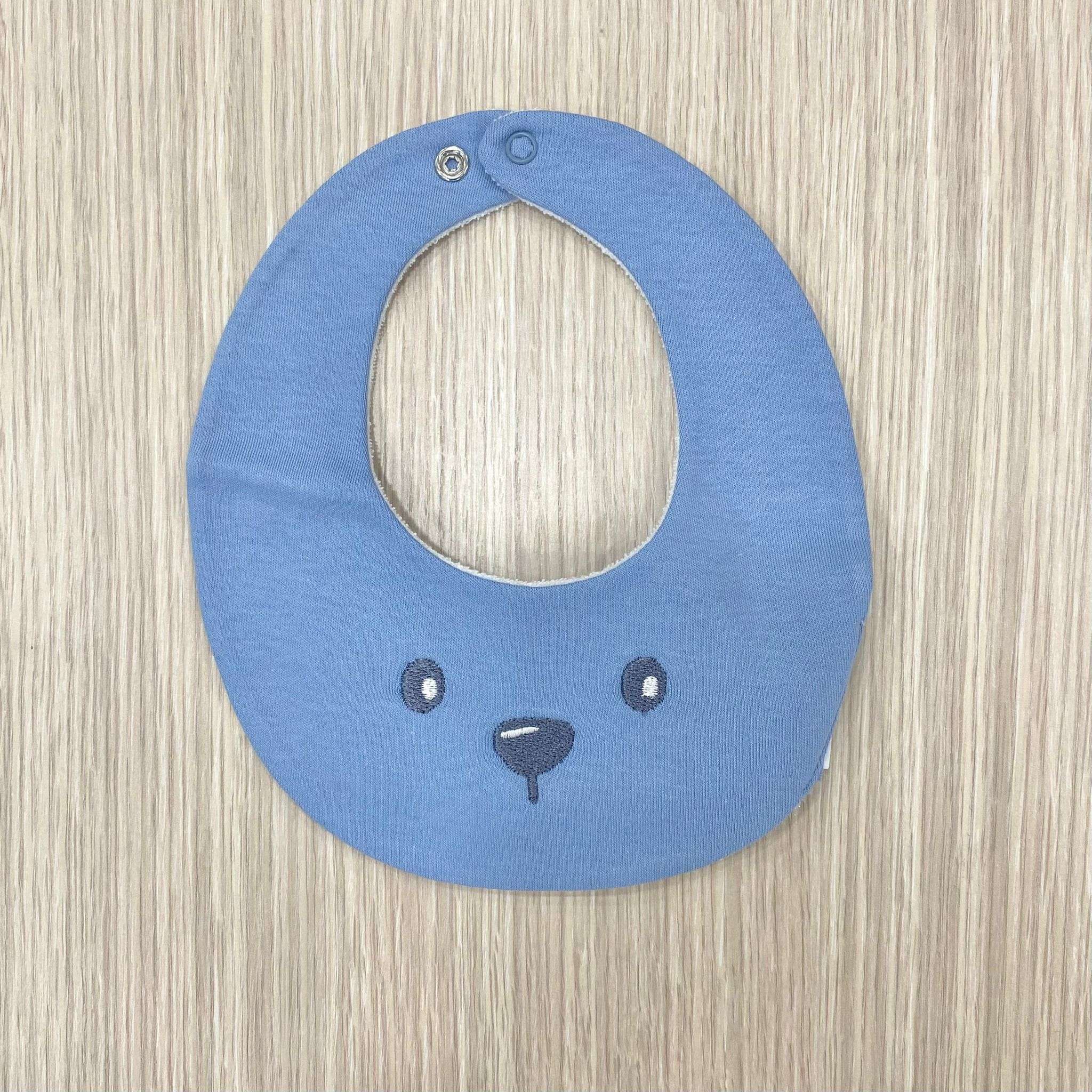 Bavetta neonato in spugna di cotone, di colore azzurro con disegno ricamato.