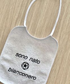 Bavetta neonato in cotone, di colore bianco e nero, con scritta ricamata.