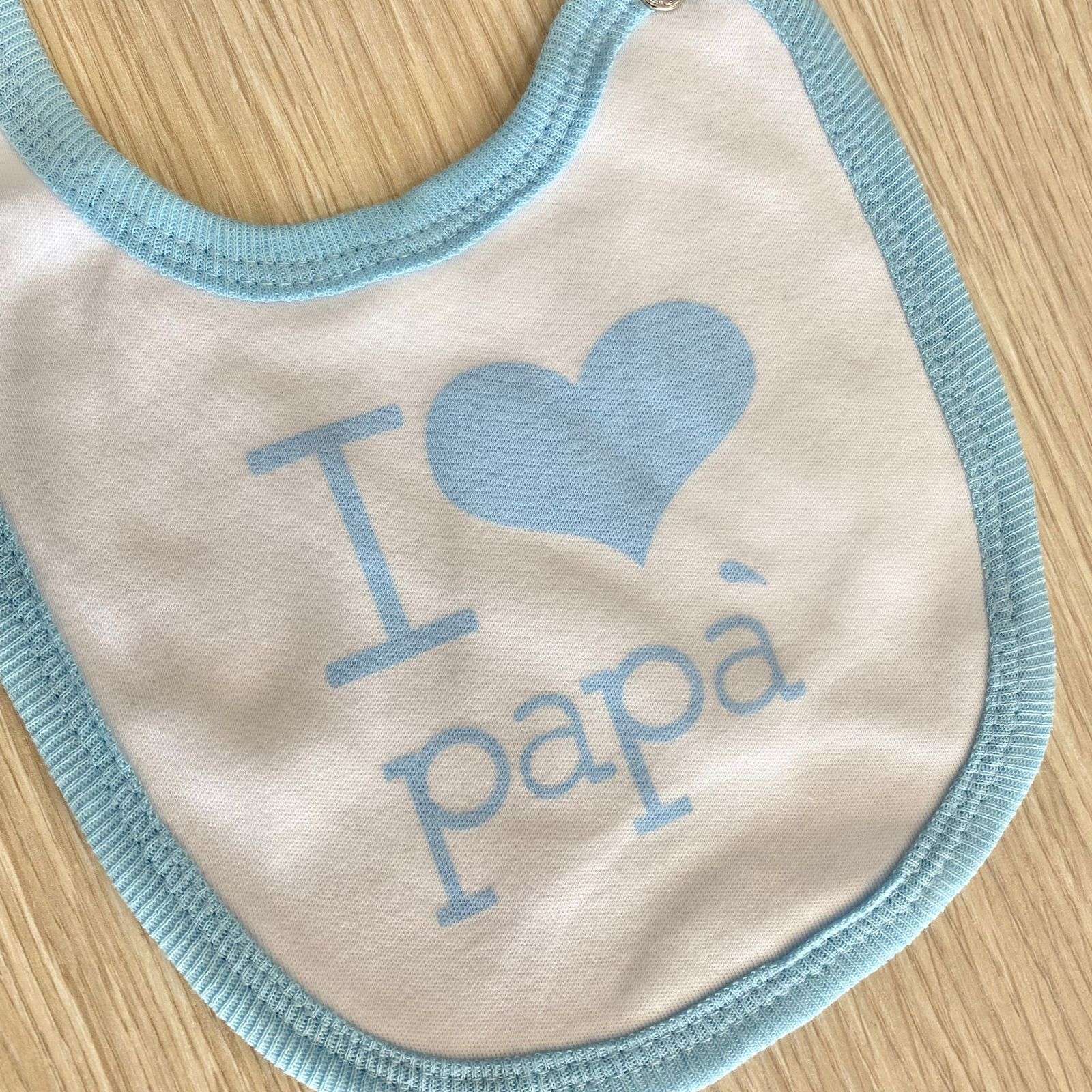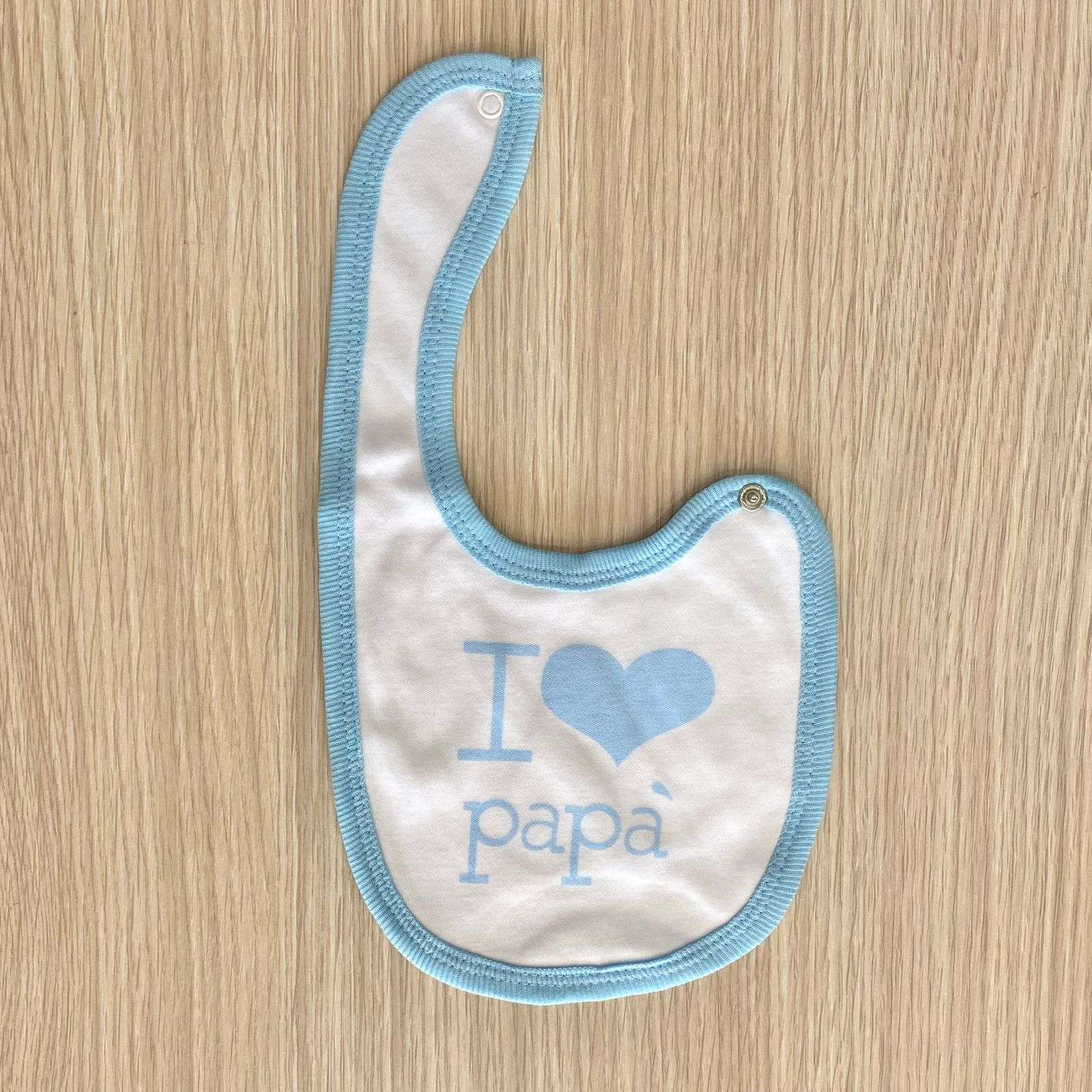 Bavetta neonato in cotone di colore bianco con bordino e scritta di colore azzurro.