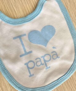 Bavetta neonato in cotone di colore bianco con bordino e scritta di colore azzurro.