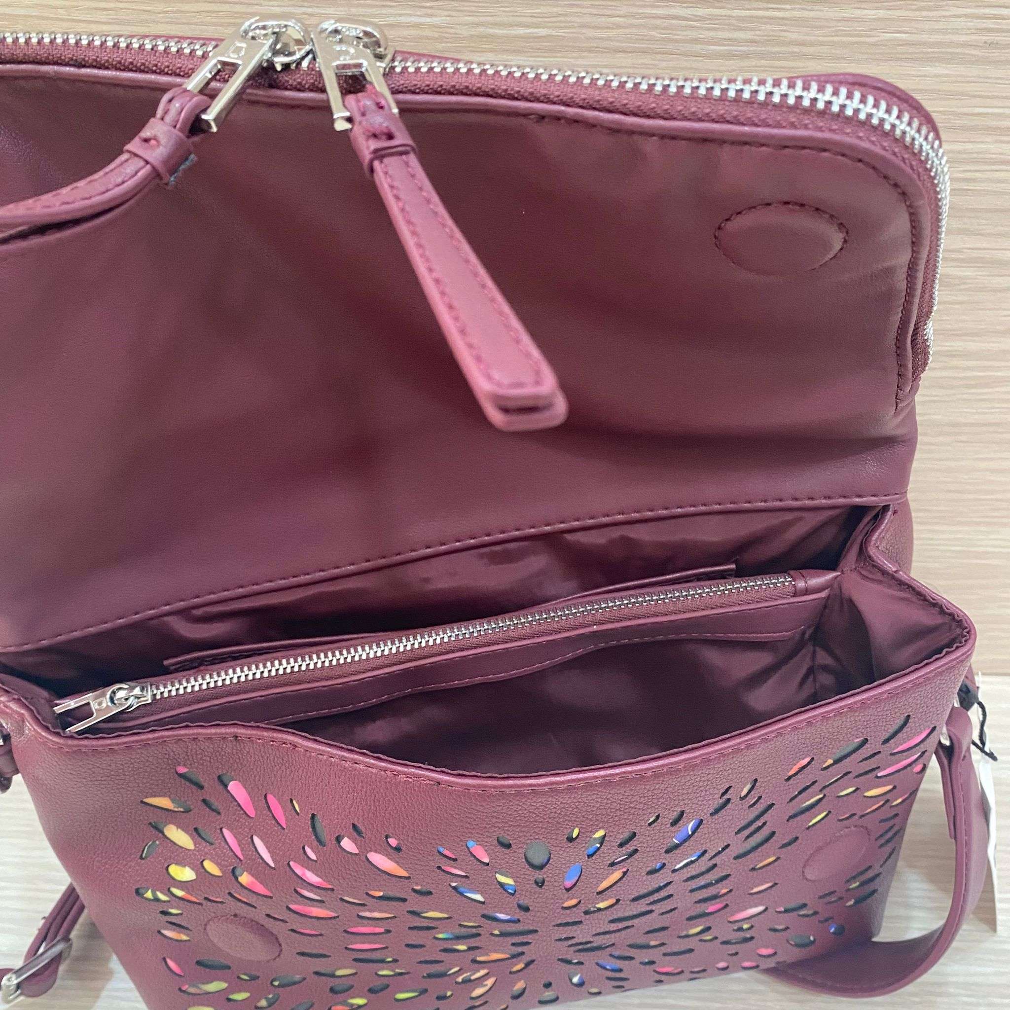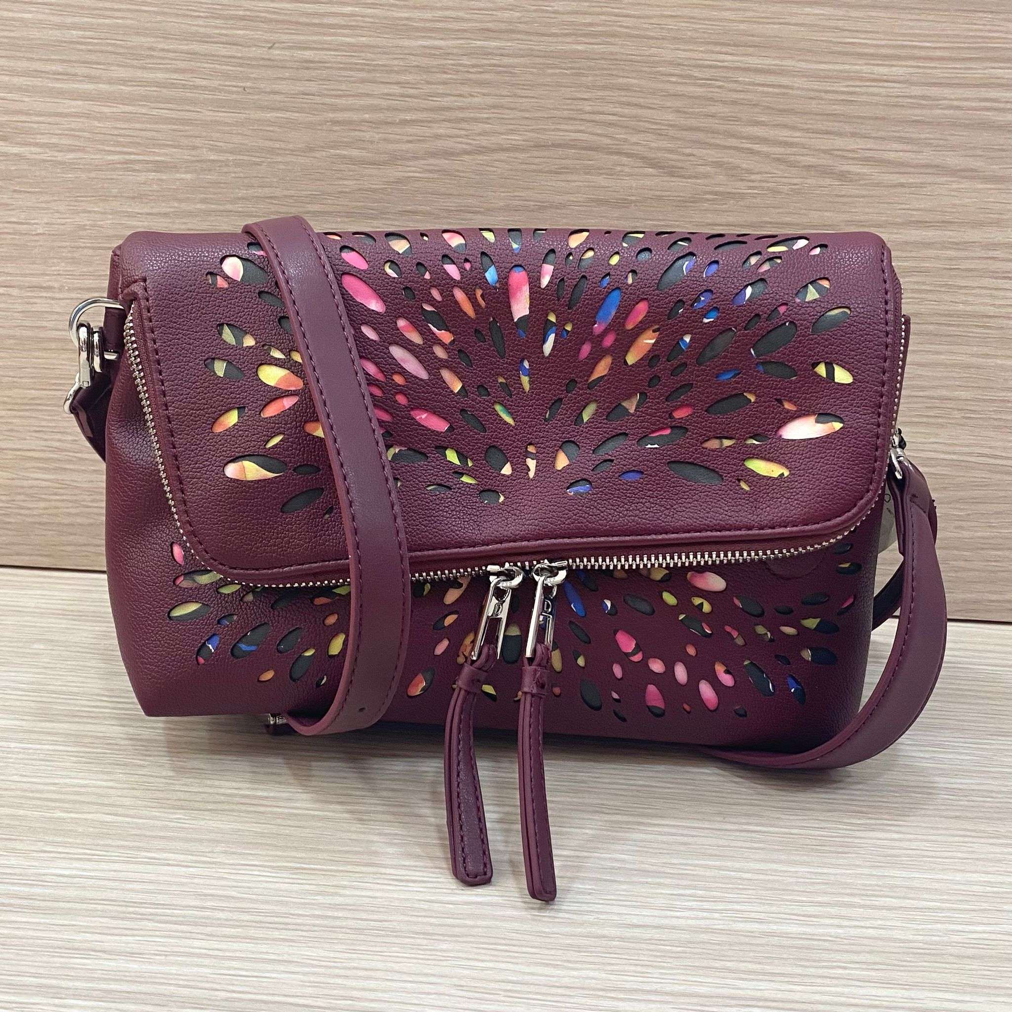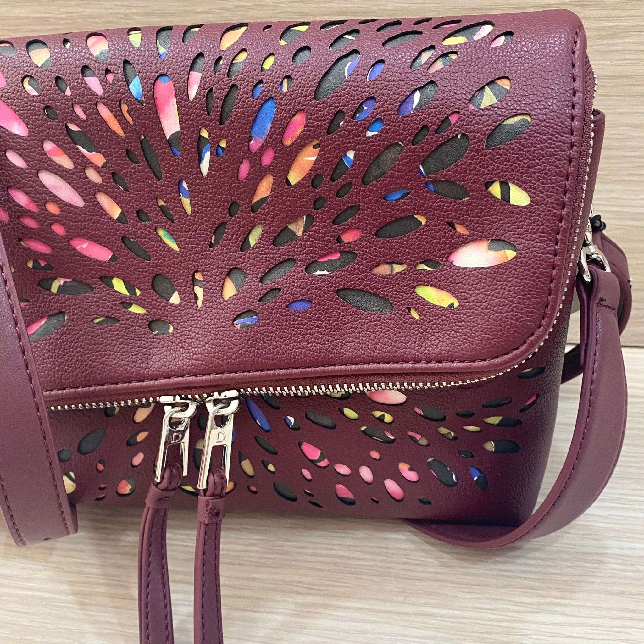Borsa a mano e a tracolla effetto pelle traforata con sfondo colorato.