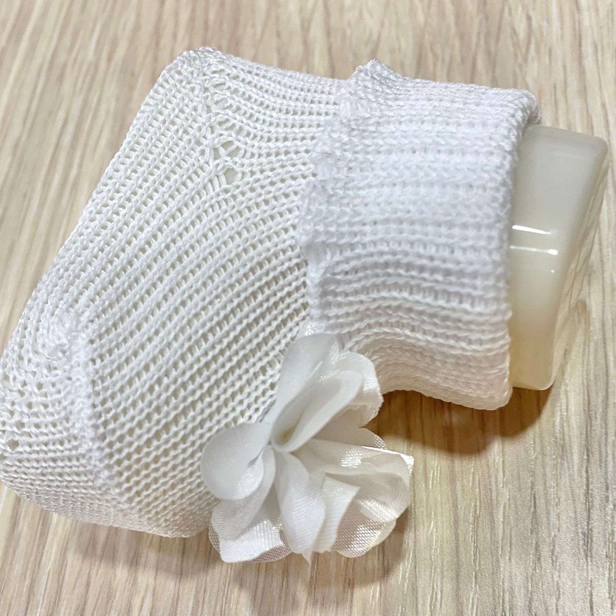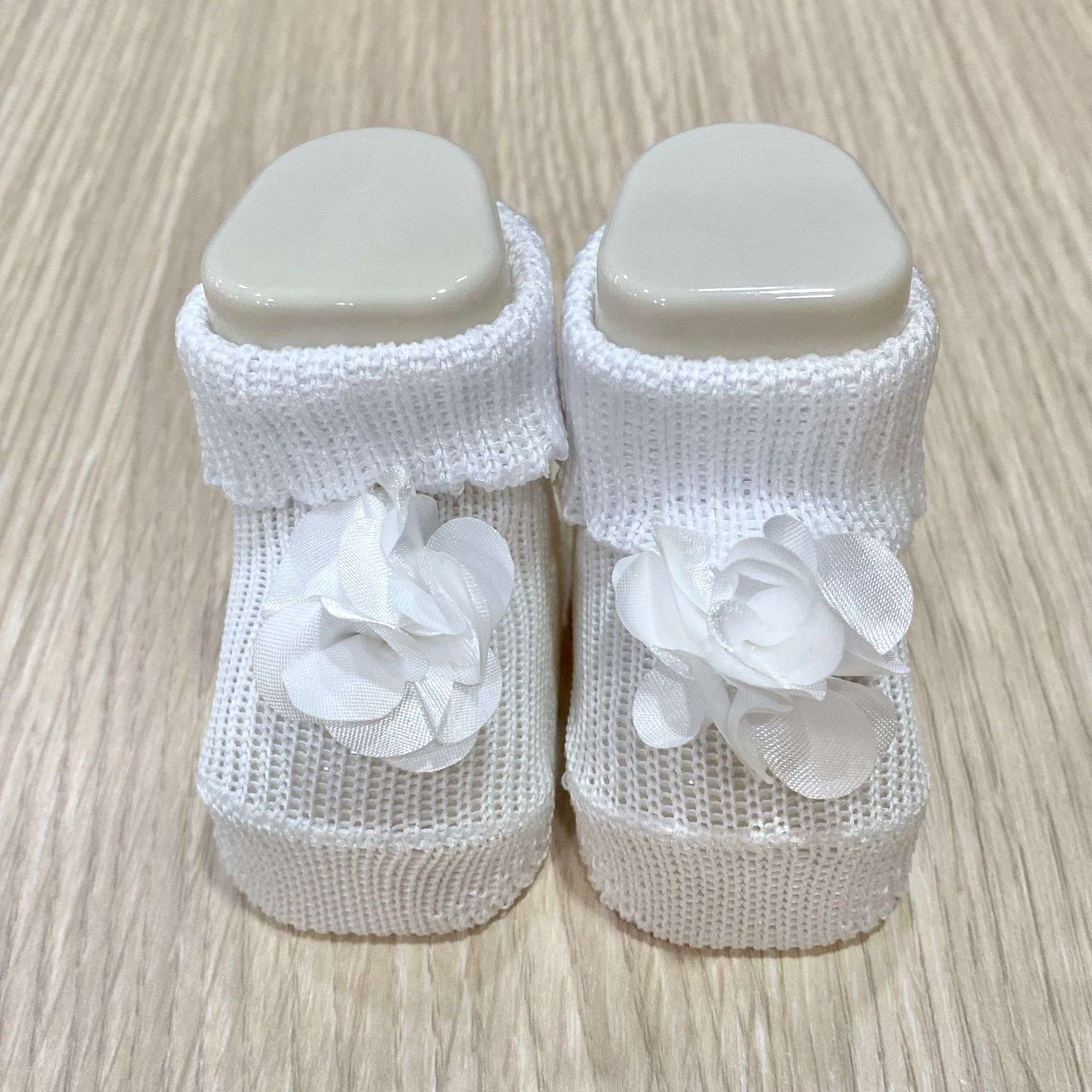 Calzini neonata in filo, di colore bianco, con applicazione di fiorellini in organza di colore bianco.