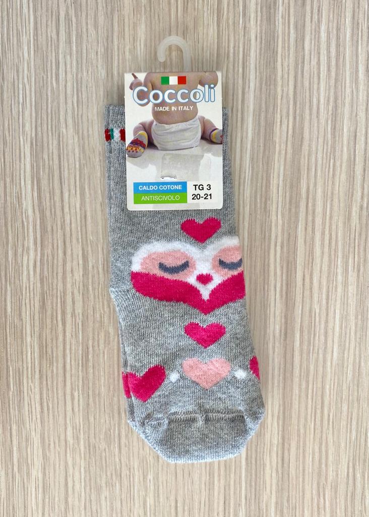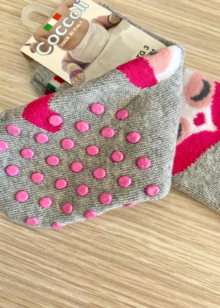 Calzino antiscivolo neonata/bambina in spugna di caldo cotone, di colore grigio e dettagli di vari colori.